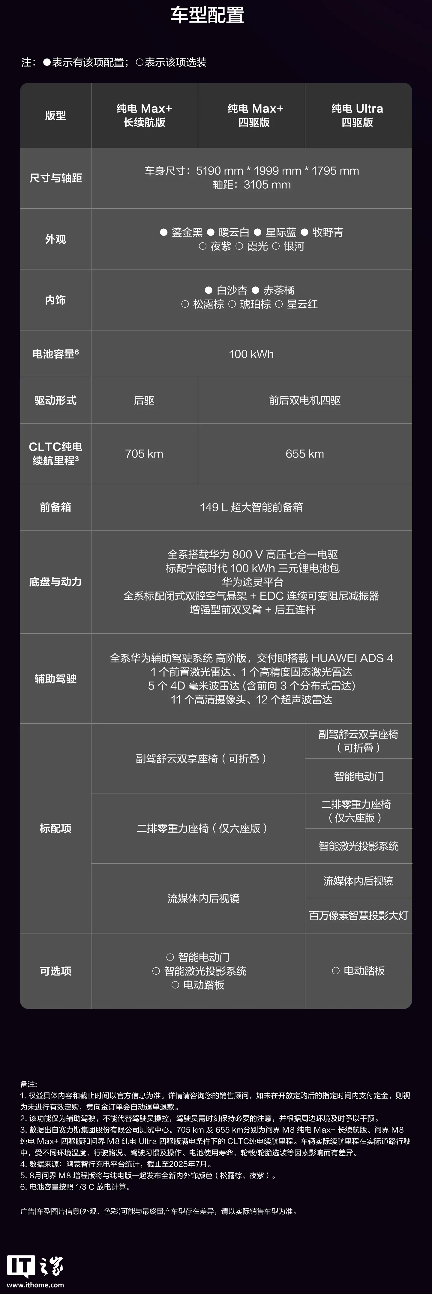 IT之家 8 月 25 日消息,鸿蒙智行“家庭智慧旗舰 SUV”问界 M8 纯电版今日正式上市,新车提供五座、六座两种车型,号称“纯电之王”。其搭载华为高压七合一电驱,标配宁德时代 100kWh 电池。