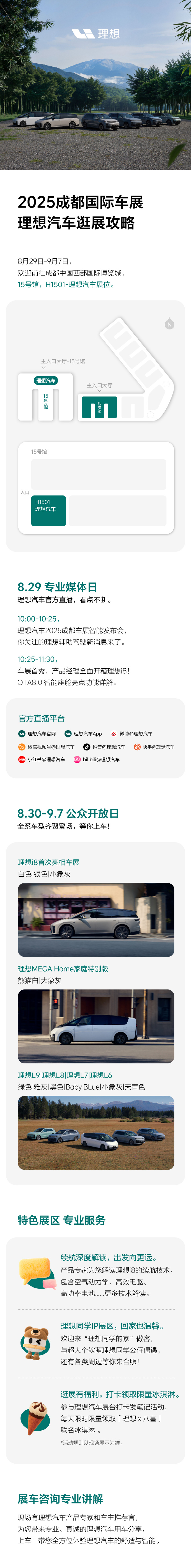 IT之家 8 月 25 日消息,2025 成都国际汽车展览会将于 8 月 29 日至 9 月 7 日在中国西部国际博览城举行,理想汽车今日发布逛展攻略。