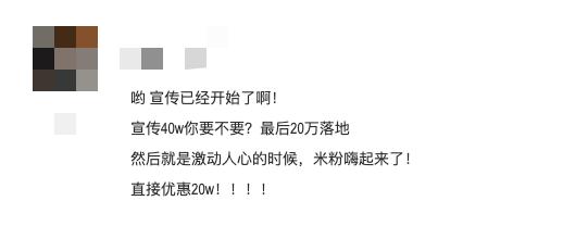 对此网友表示 “ 宣传 40 万,最后 20 万落地 ” ,也是按照小米惯有的逻辑,不少网友对这波预测价格持怀疑态度。