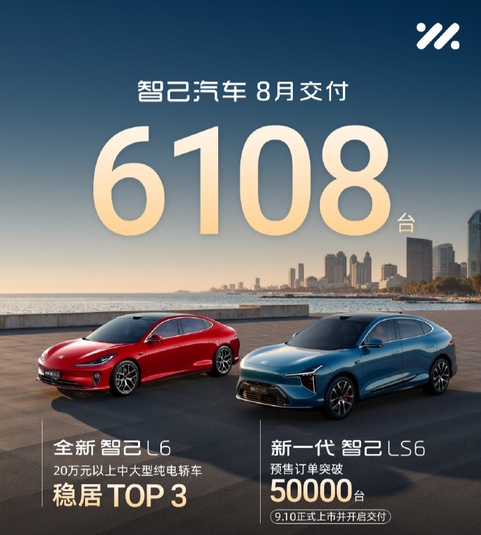 9月1日,智己汽车宣布8月交付6108台,全新智己L6成20万以上中大型纯电轿车销量TOP3。新一代智己LS6小订已破5万,将于9月10日正式上市。