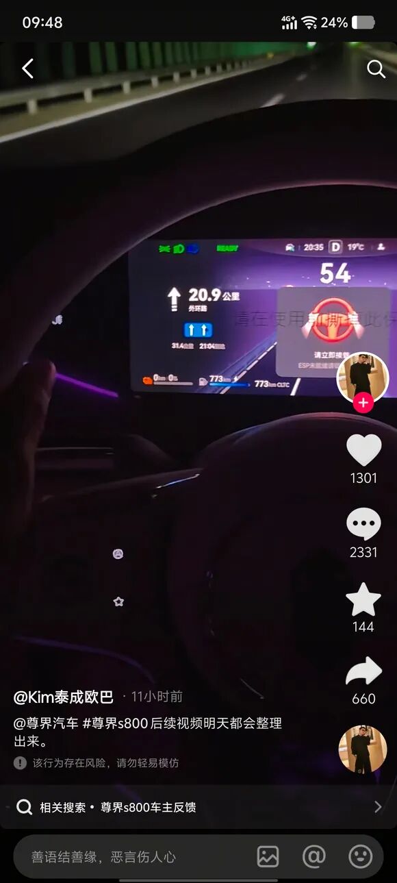 围绕“尊界S800失速”视频博主“Kim泰成欧巴”的身份,网上也开始出现“爆料”。