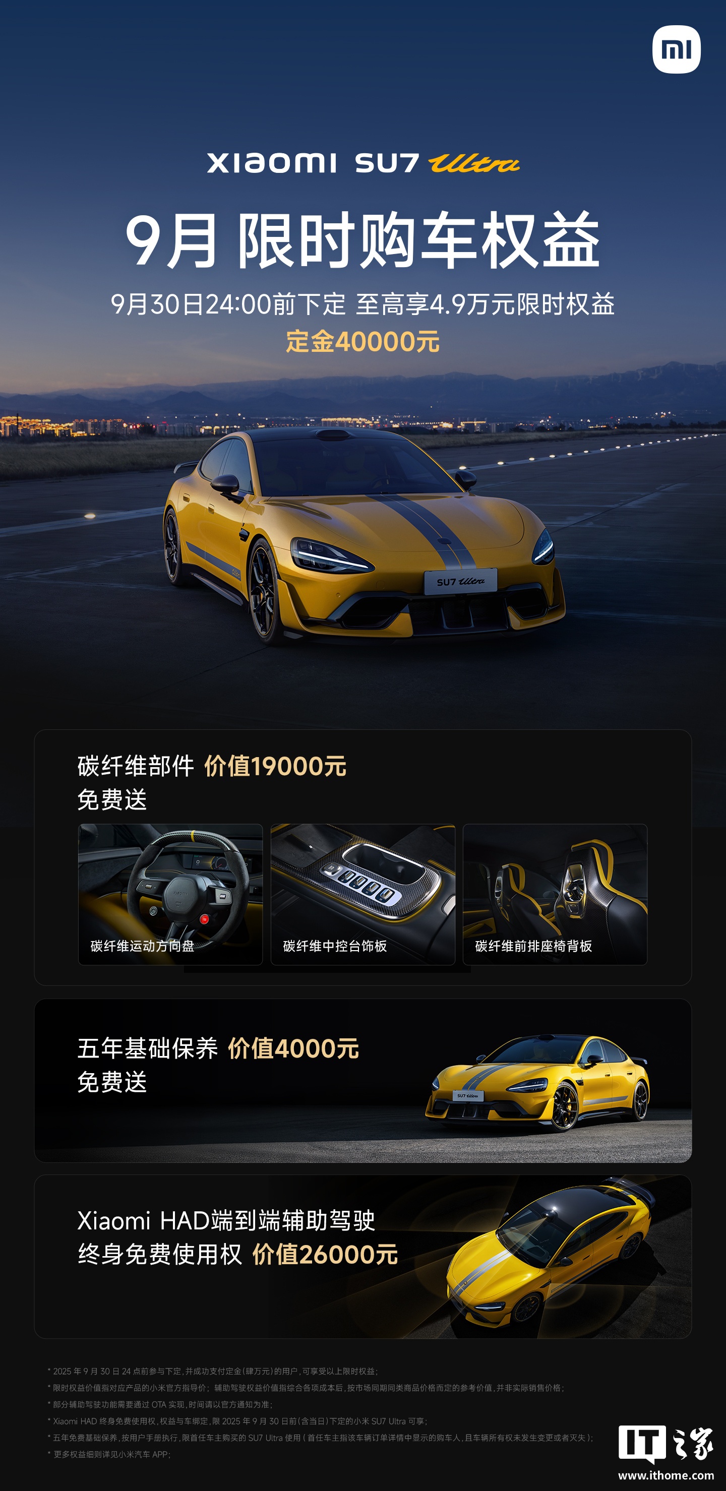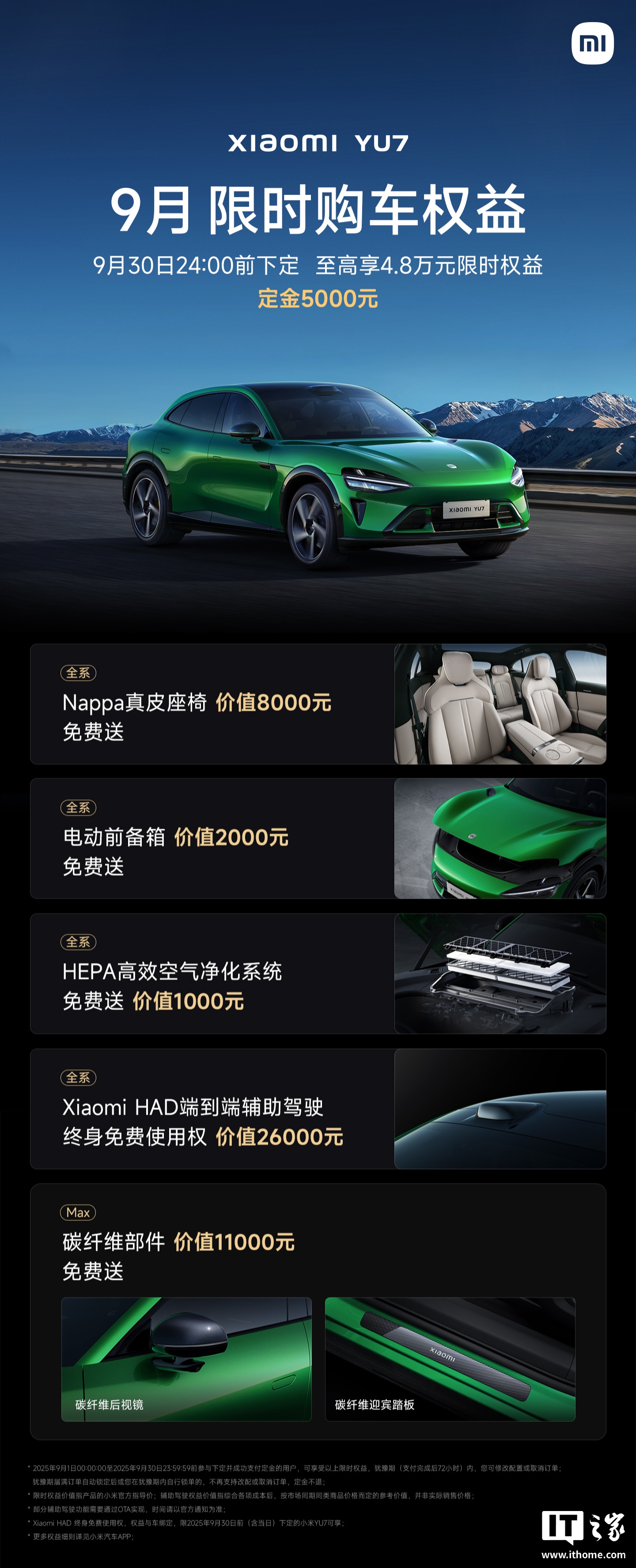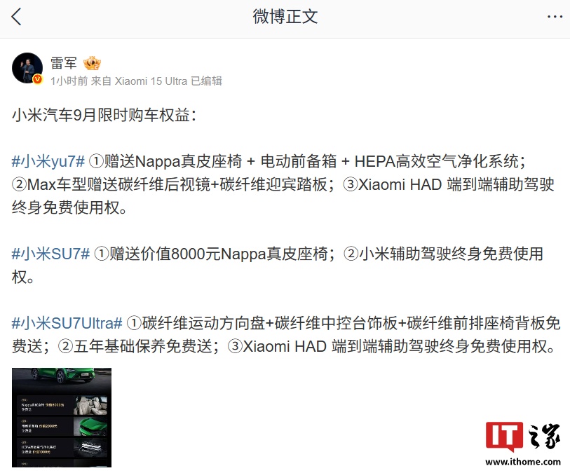 IT之家 9 月 1 日消息,小米创办人、董事长兼 CEO 雷军今日发布了小米汽车 9 月限时购车权益,其中 YU7、SU7、SU7 Ultra 的权益均包含辅助驾驶终身免费使用权。