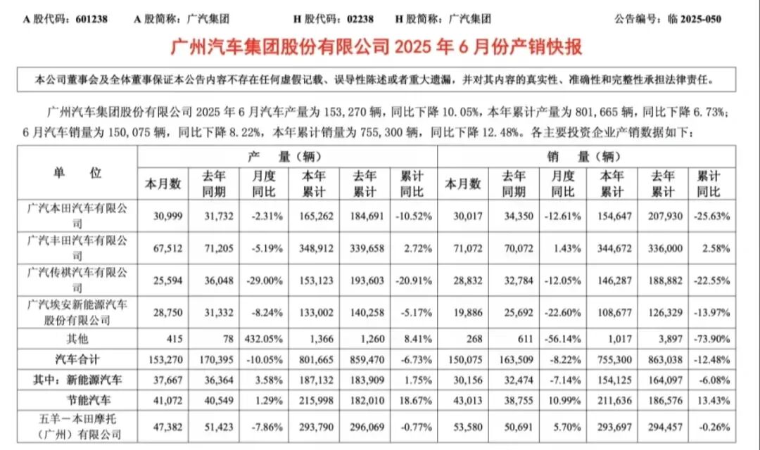 一个月后,广汽集团披露半年报,继2024年广汽集团首次录得年度亏损后,此次半年报创下20年来首次半年亏损记录——2025年上半年广汽集团实现营业收入421.66亿元,同比下降7.95%;归属于上市公司股东的净利润亏损25.38亿元,上年同期净利润15.16亿元,由盈转亏;扣非净亏损29.45亿元,上年同期为3.38亿元。