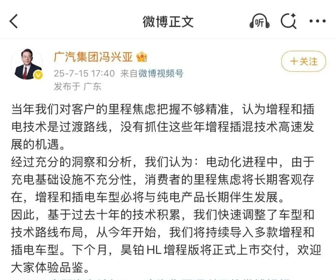 此外,曾自诩为新能源转型先锋的广汽却“起了大早,赶了晚集”。一方面,高管坦诚战略判断上出现失误——“当年我们对客户的里程焦虑把握不够精准,认为增程和插电技术是过渡路线,没有抓住这些年增程插混技术高速发展的机遇。”