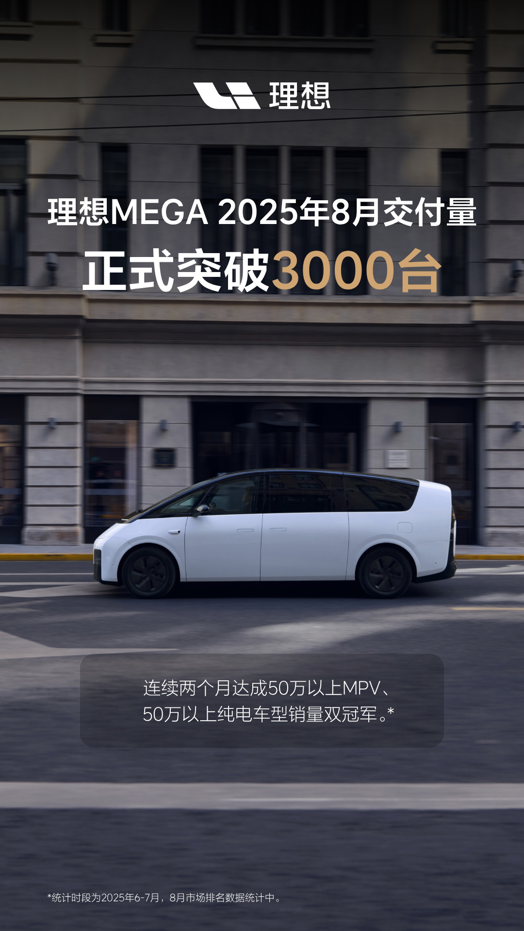 IT之家注意到,理想汽车今日发布销量数据:理想家庭科技旗舰 MPV—— 理想 MEGA 月交付正式突破 3000 台,连续两月达成 50 万以上 MPV、50 万以上纯电车型销量双冠军。