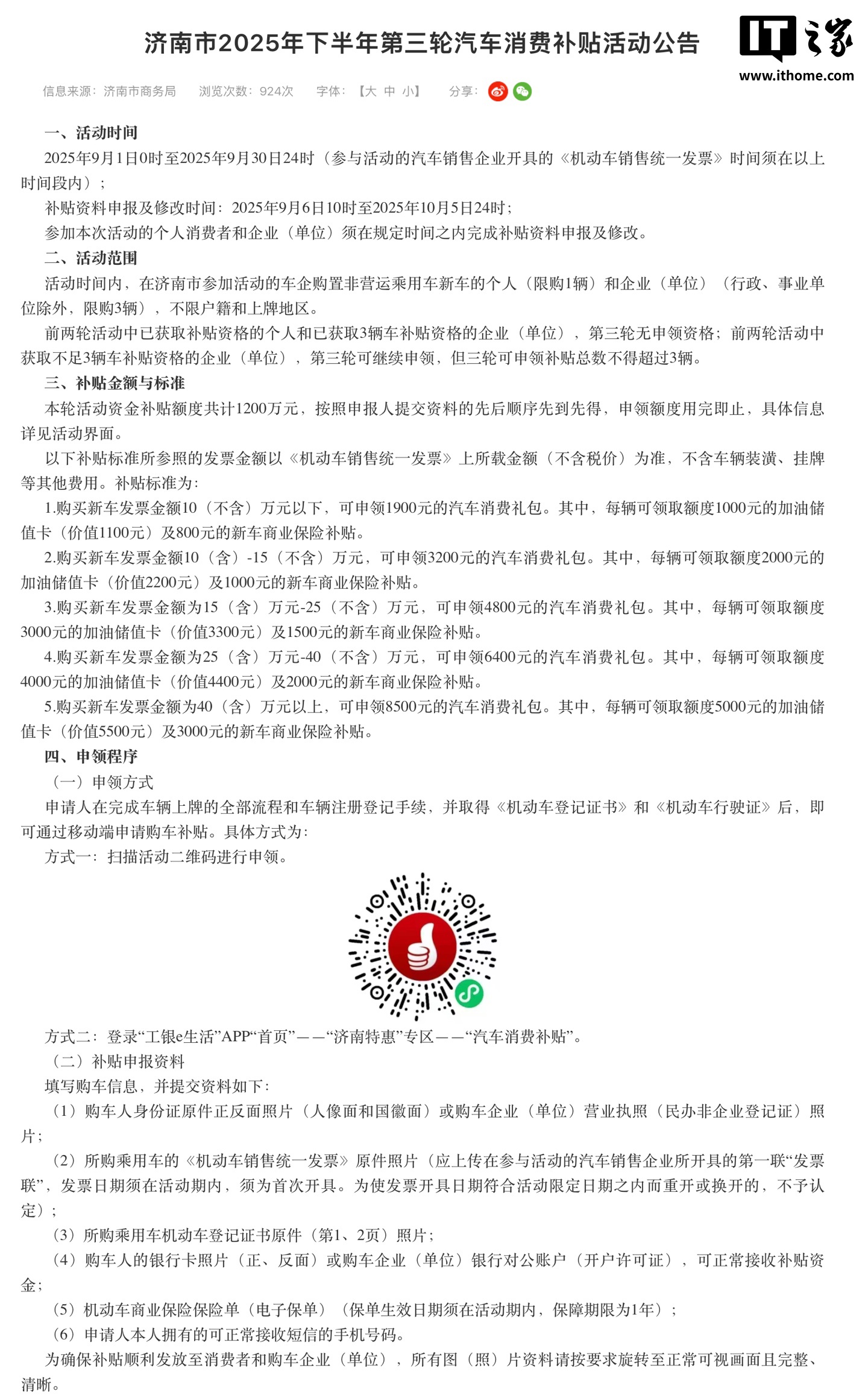 IT之家 9 月 1 日消息,据济南市商务局,济南市 2025 年下半年第三轮汽车消费补贴活动于 9 月 1 日零时正式启动,本轮活动资金补贴额度共计 1200 万元,按照申报人提交资料的先后顺序先到先得,申领额度用完即止,补贴活动持续至 9 月 30 日 24 时。