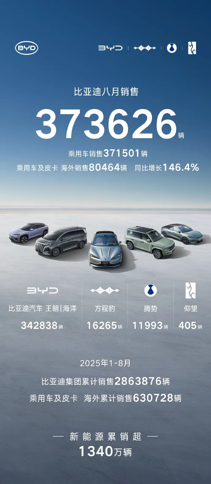 比亚迪8月新能源汽车销量达37.36万辆,与上年同期的37.31万辆基本持平。其中纯电动乘用车销量为19.96万辆,占比超过50%。插电混动车型继续保持强劲表现。