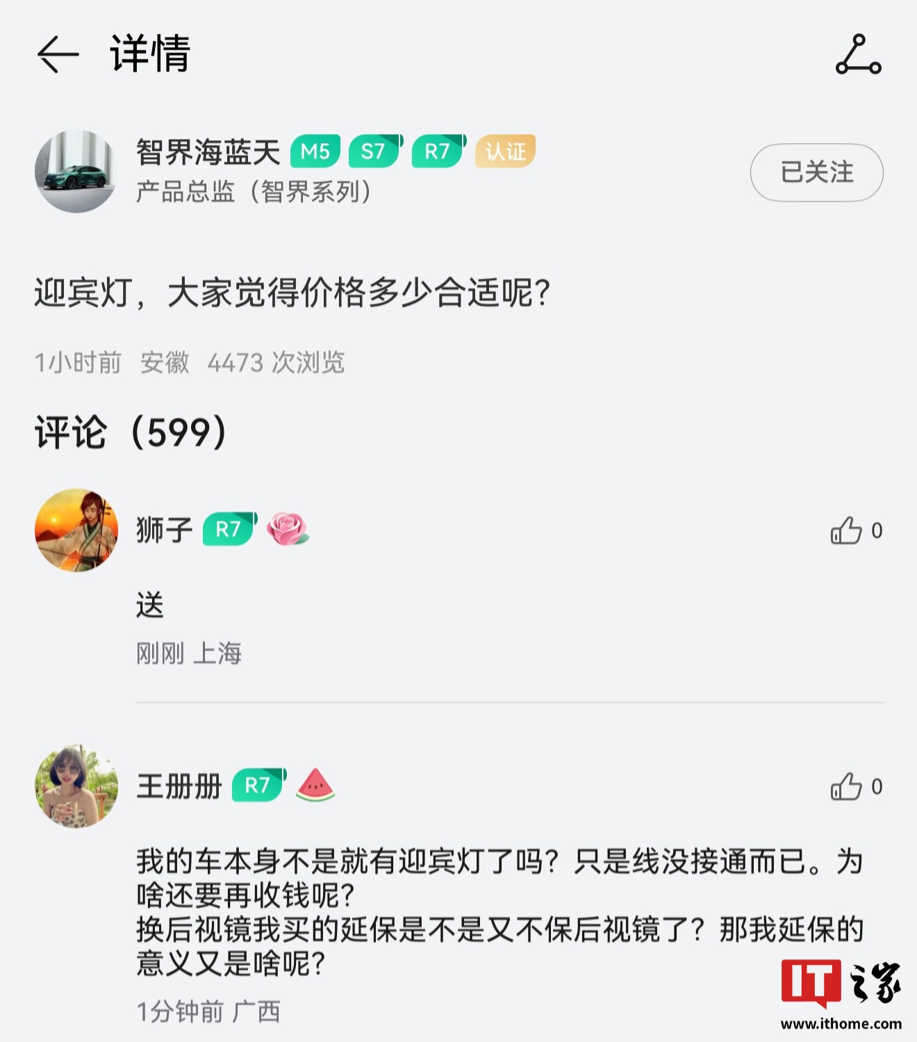 IT之家注意到,智界系列产品总监 @智界海蓝天 今日在鸿蒙智行 App 开启 Logo 迎宾灯的售价调研,询问价格多少合适。不少老车主提出“送”的建议,并有人直言车本身就有迎宾灯,只是线没接通。