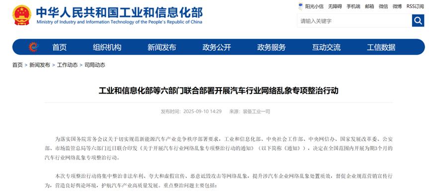 △工业和信息化部等六部门联合部署开展汽车行业网络乱象专项整治行动 图源:工信部官网