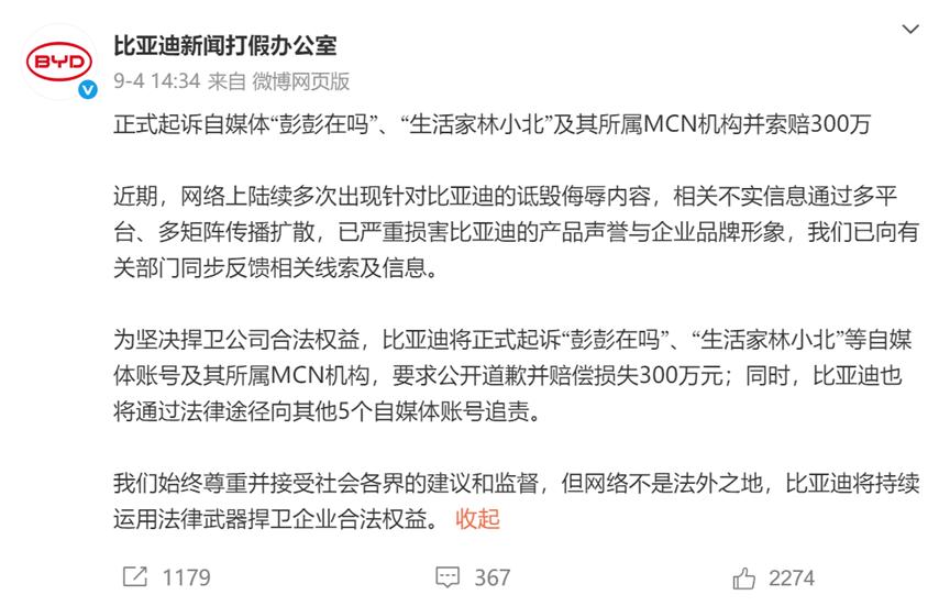 针对部分自媒体及其关联MCN机构的恶意抹黑行为,比亚迪已于9月4日正式提起诉讼,要求公开道歉并索赔300万元。同时,另有5个自媒体账号因长期发布不实信息,已被纳入法律追责程序。