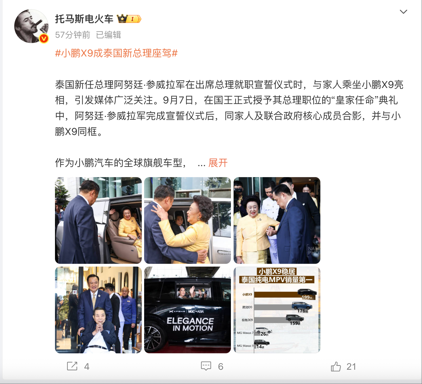 凤凰网科技讯 9月10日,小鹏汽车副总裁@托马斯电火车发文称,泰国新任总理阿努廷·参威拉军在出席总理就职宣誓仪式时,与家人乘坐小鹏X9亮相。