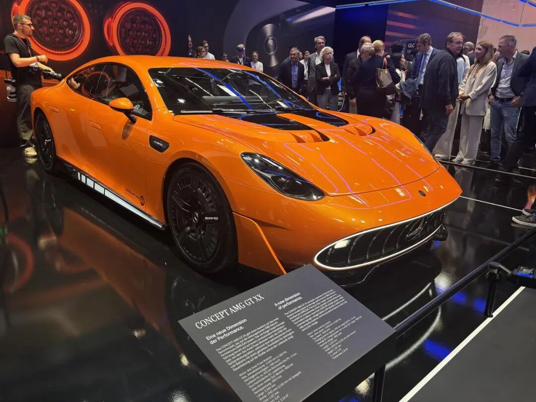 奔驰展位不大,只展两辆就够了:一辆 AMG GTXX 概念车,零百加速小于 2.5 秒的 1360 马力纯电超跑,另一辆就是奔驰 GLC 纯电版。