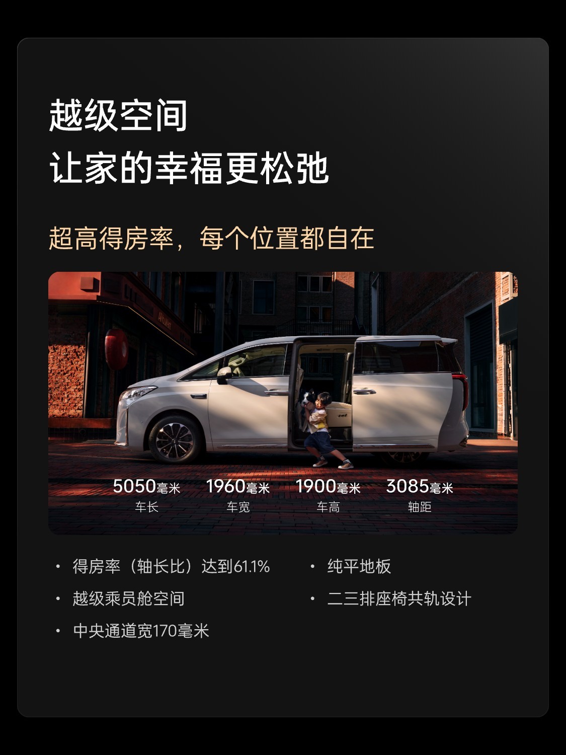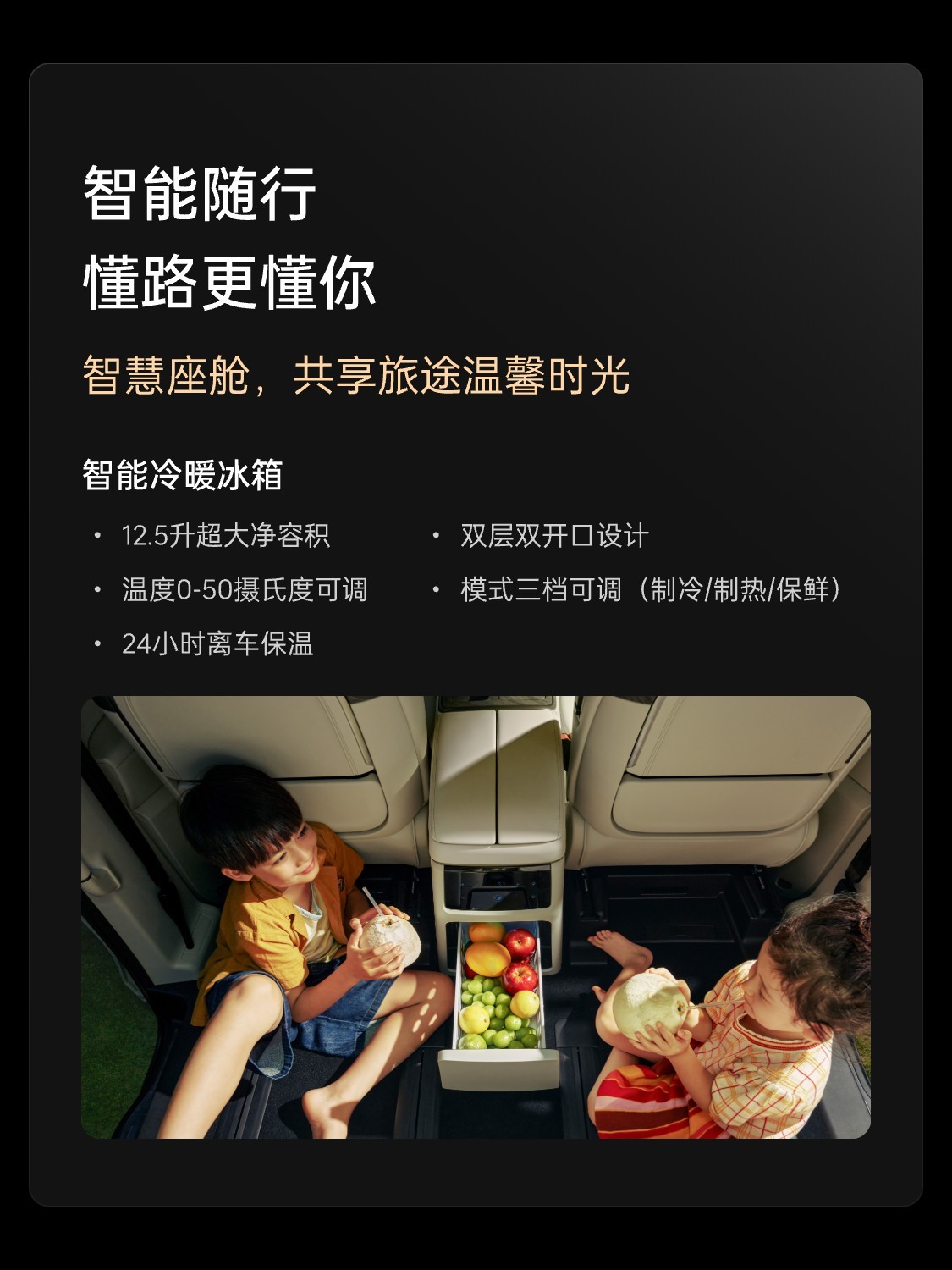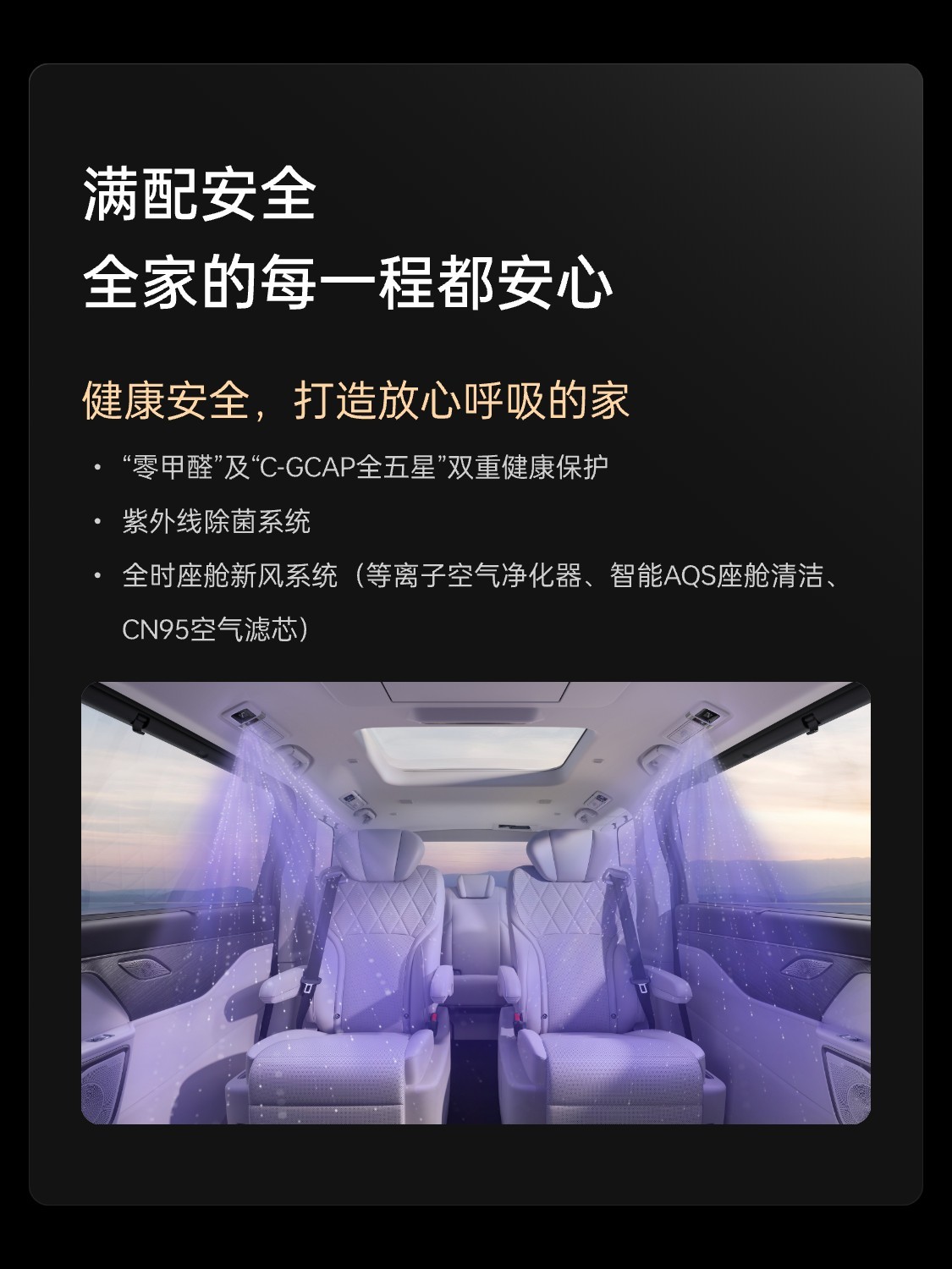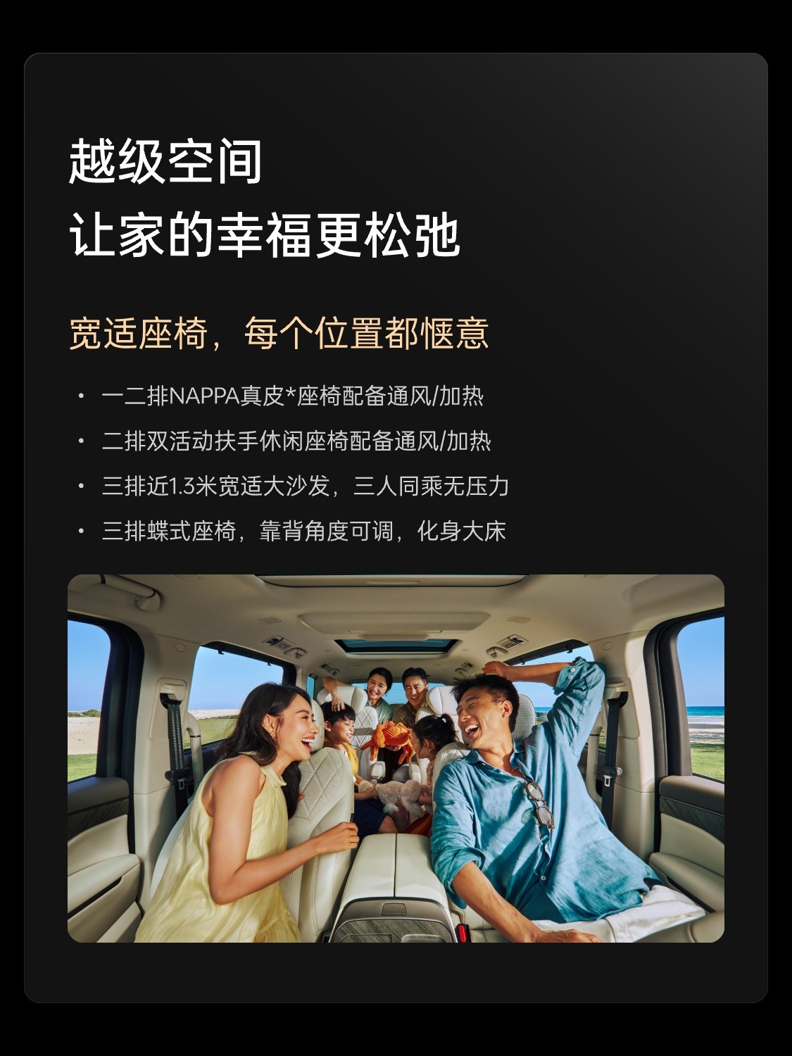 该车座舱内配备 15.6 英寸 2.5K 双联屏、12.3 英寸液晶仪表和 26 英寸 SR-HUD 抬头显示,配置包括手机无线充电、电子怀挡、副驾按摩座椅等,车内采用 2+2+3 的 7 座布局,第二排座椅支持加热、通风,可选按摩;第二排还配备吸顶娱乐屏、折叠小桌板等,车内还有冷暖冰箱。