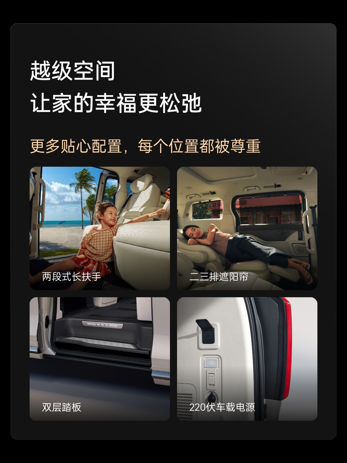魏牌高山 7 定位“一家人的移动大客厅”,标配 Hi4 智能电四驱、Coffee Pilot 辅助驾驶系统等。