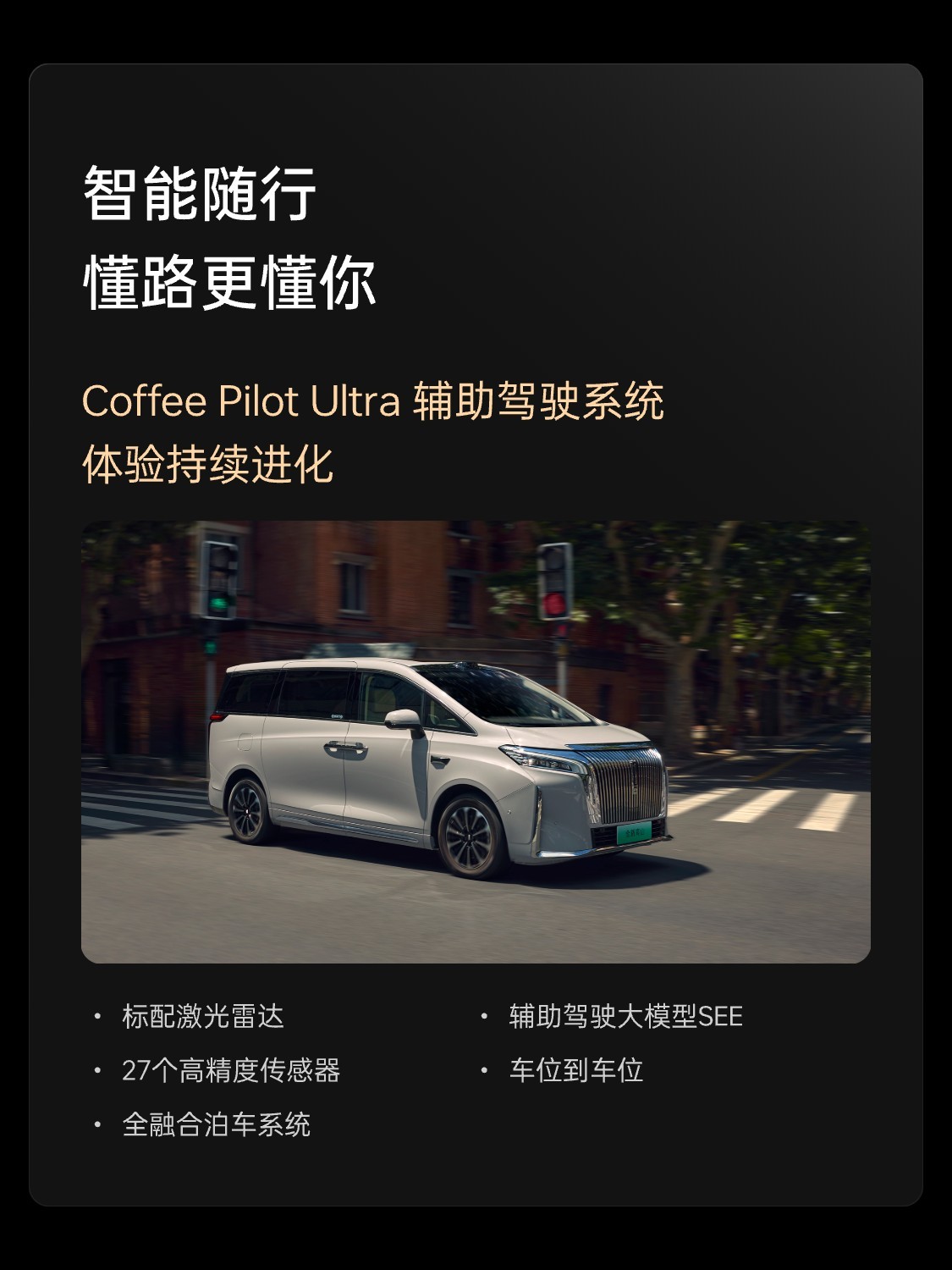 高山 7 配备 128 线激光雷达,标配长城第三代智能驾驶系统 Coffee Pilot Ultra,可自行学习出行习惯,实现全天候路况感知和无图全场景 NOA 覆盖,高速、城区及乡镇路况均支持智能驾驶辅助。端到端大模型还可以实现车位到车位的辅助驾驶,同时支持遥控泊车、记忆泊车。