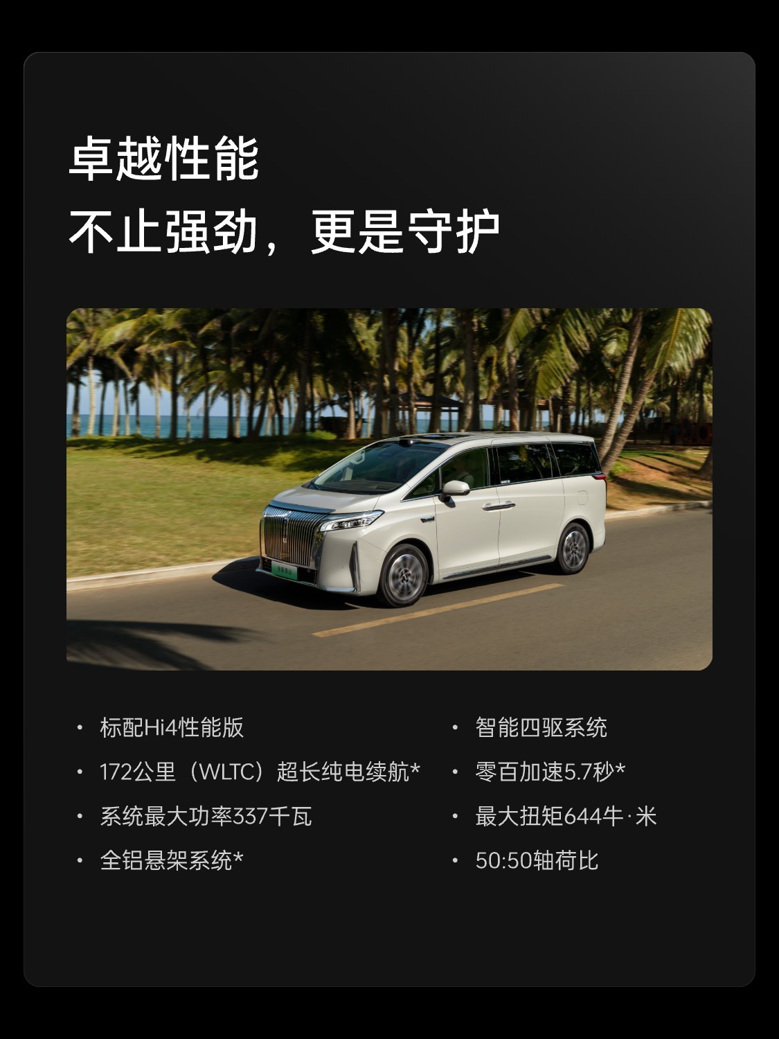 新车搭载长城汽车 Hi4 性能版智能四驱电混技术,采用混联 + 4 挡 + 前后轴双电机配置,集成了增程、并联、直驱等混动模式,系统综合功率 337kW,综合扭矩 644N・m,WLTC 综合续航里程 945km,支持 3.3kW 外放电。