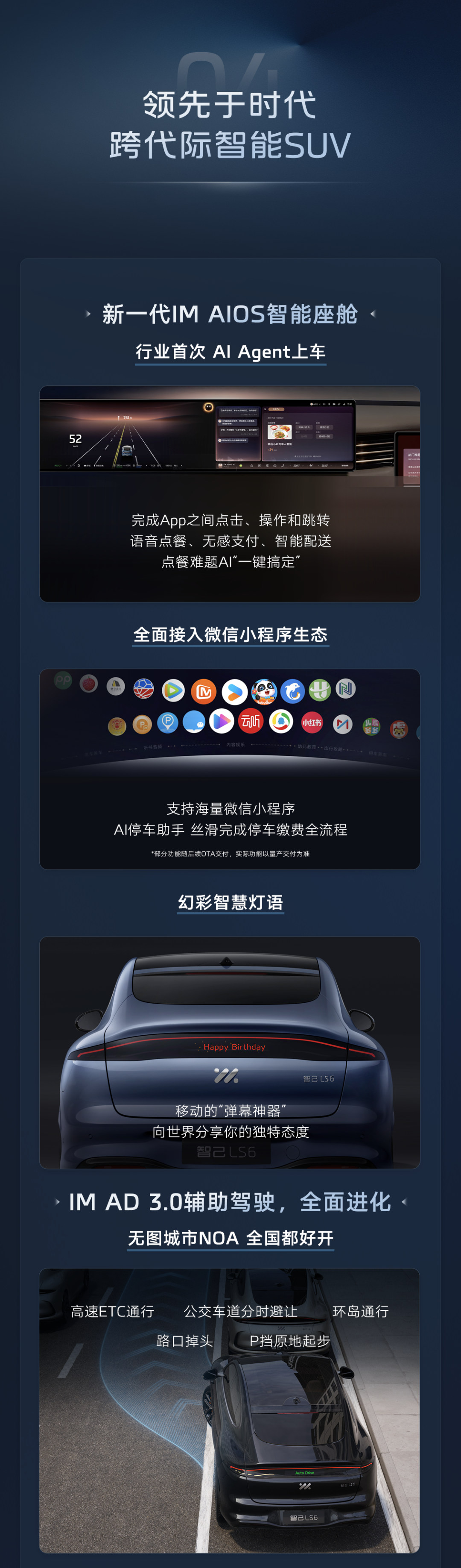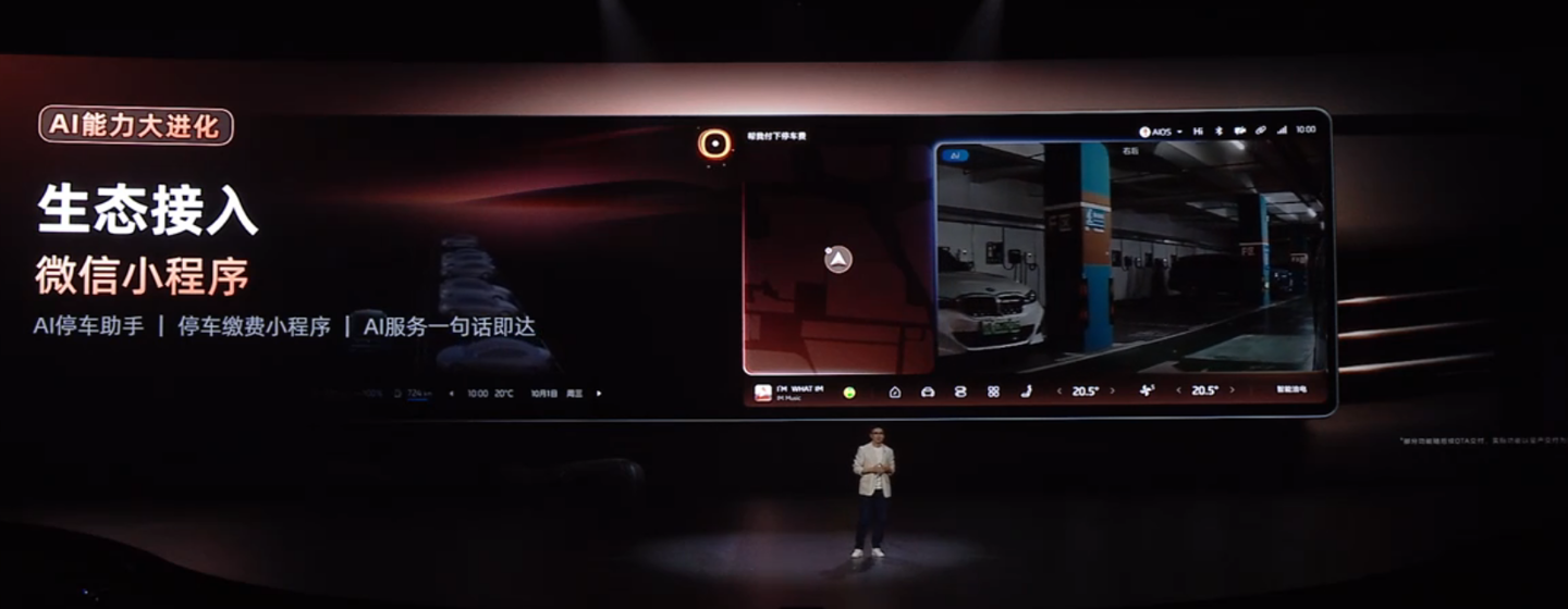 新一代智己 LS6 的 AI 能力迎来升级,AI 语音可以更好理解复杂场景,还引入了 AI 智能体功能,全面接入微信小程序生态,比如一句话即可缴费出停车场。