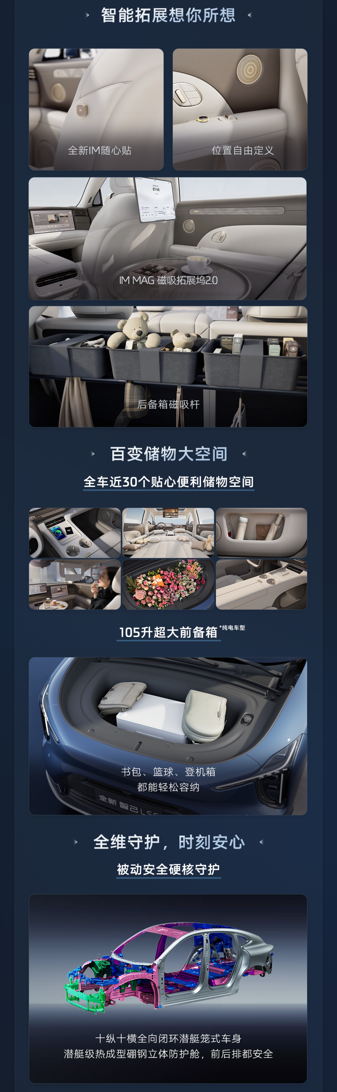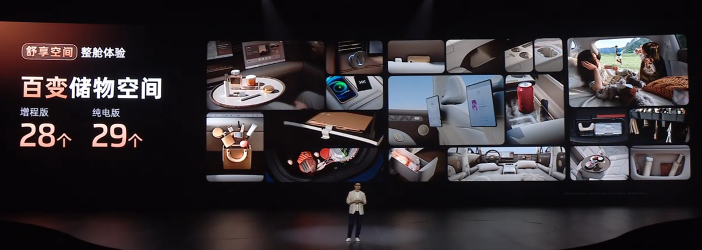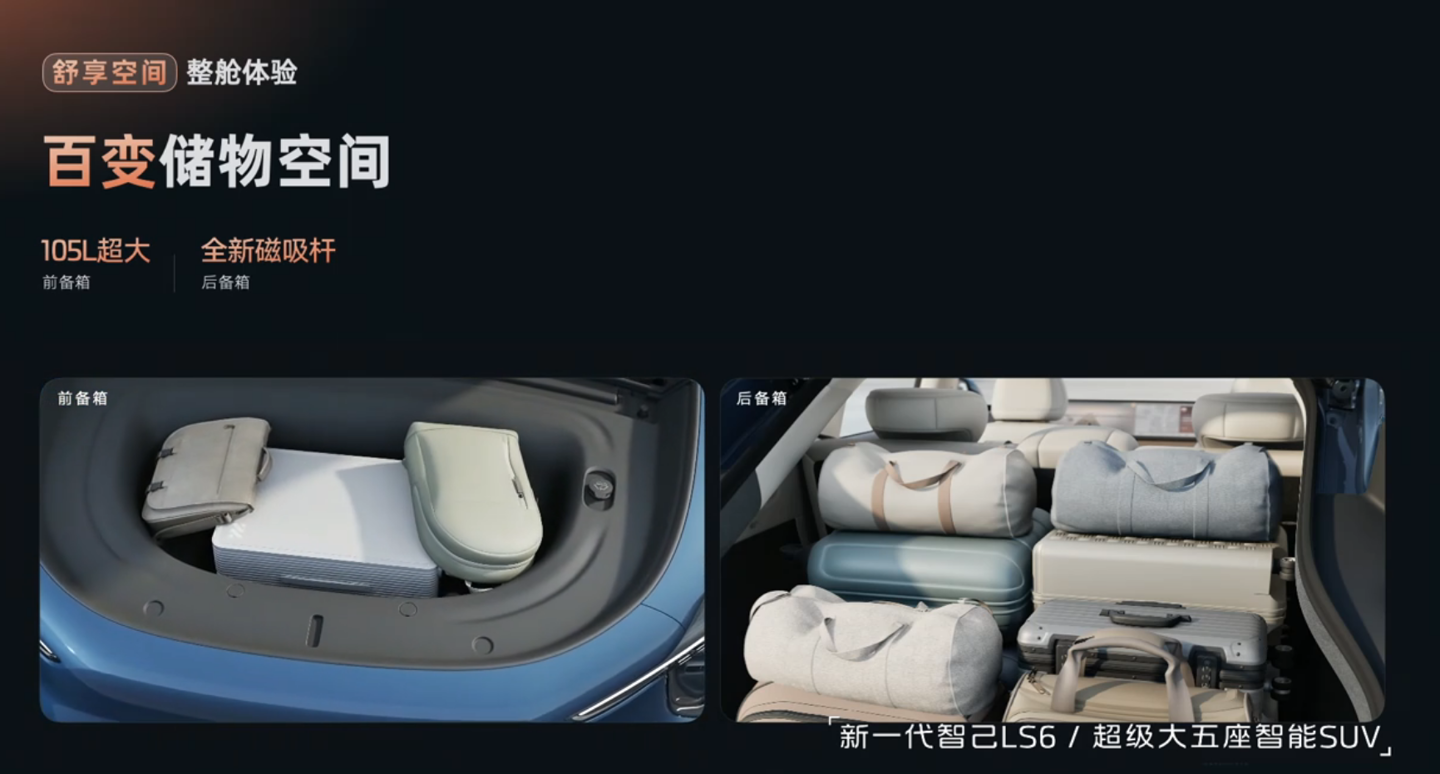 新一代智己 LS6 配有 105L 前备箱,后备箱配有全新磁吸杆;增程版拥有 28 个储物空间、纯电版拥有 29 个储物空间。