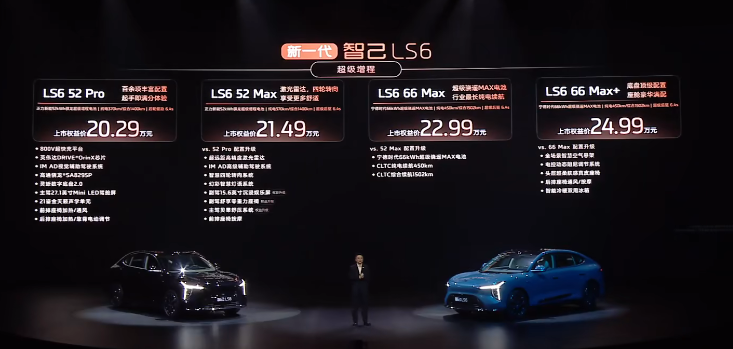 LS6 52 Max 版:新增四轮转向、激光雷达、副驾娱乐屏等,上市权益价 21.49 万元
