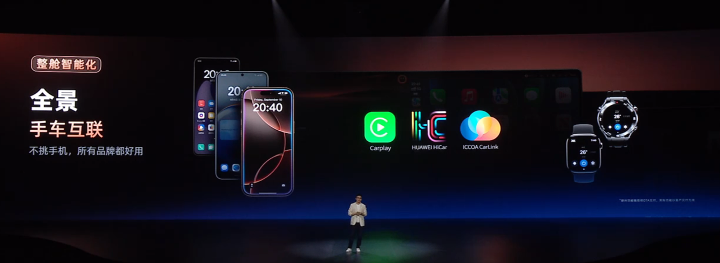 该车支持 CarPlay、HUAWEI HiCar、CarLink 手车互联,以及辅助驾驶尾部灯语。