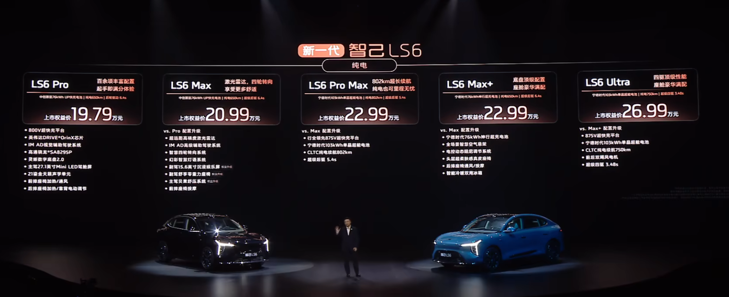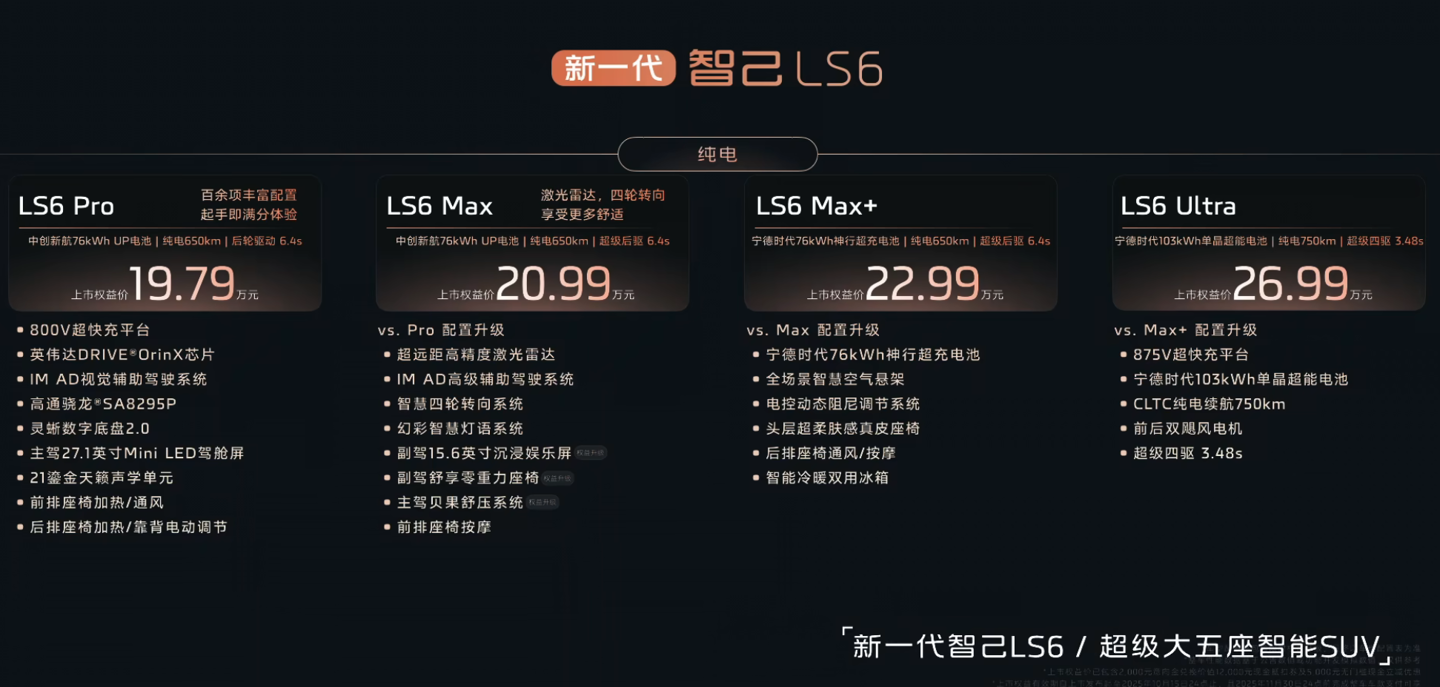 LS6 Ultra 版:宁德时代 103kWh 电池,CLTC 续航 750km,新增超级四驱(零百加速 3.48 秒),上市权益价 26.99 万元