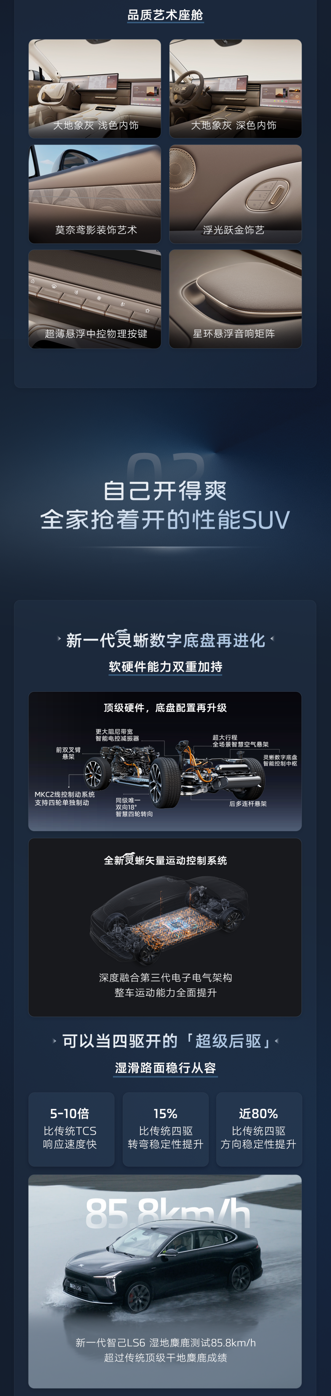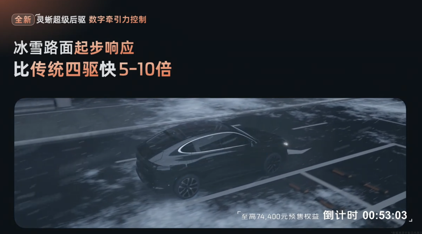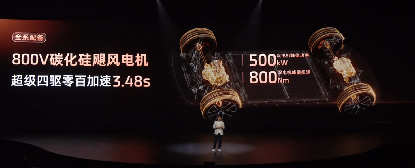 新车全系配备 800VSiC 飓风电机,顶配双电机峰值功率可达 500 千瓦,峰值扭矩 800 牛・米,百公里加速仅需 3.48 秒;还有灵蜥数字底盘 2.0,超级后驱号称“比肩四驱”,前双叉臂 + 后多连杆悬架,支持智慧四轮转向。
