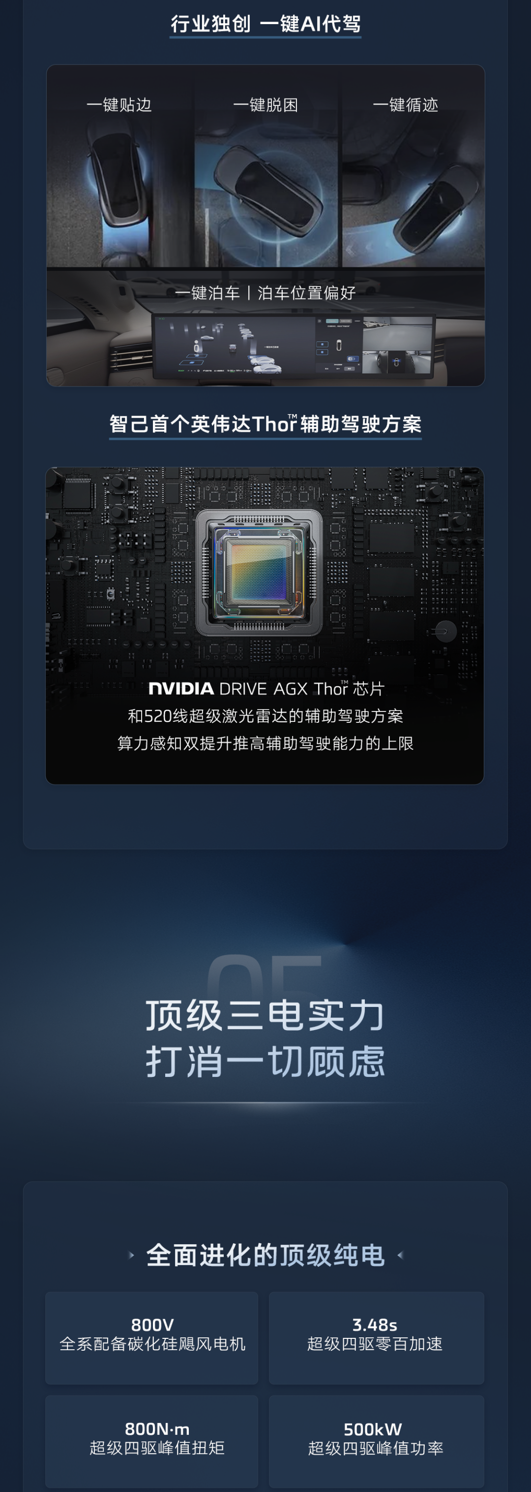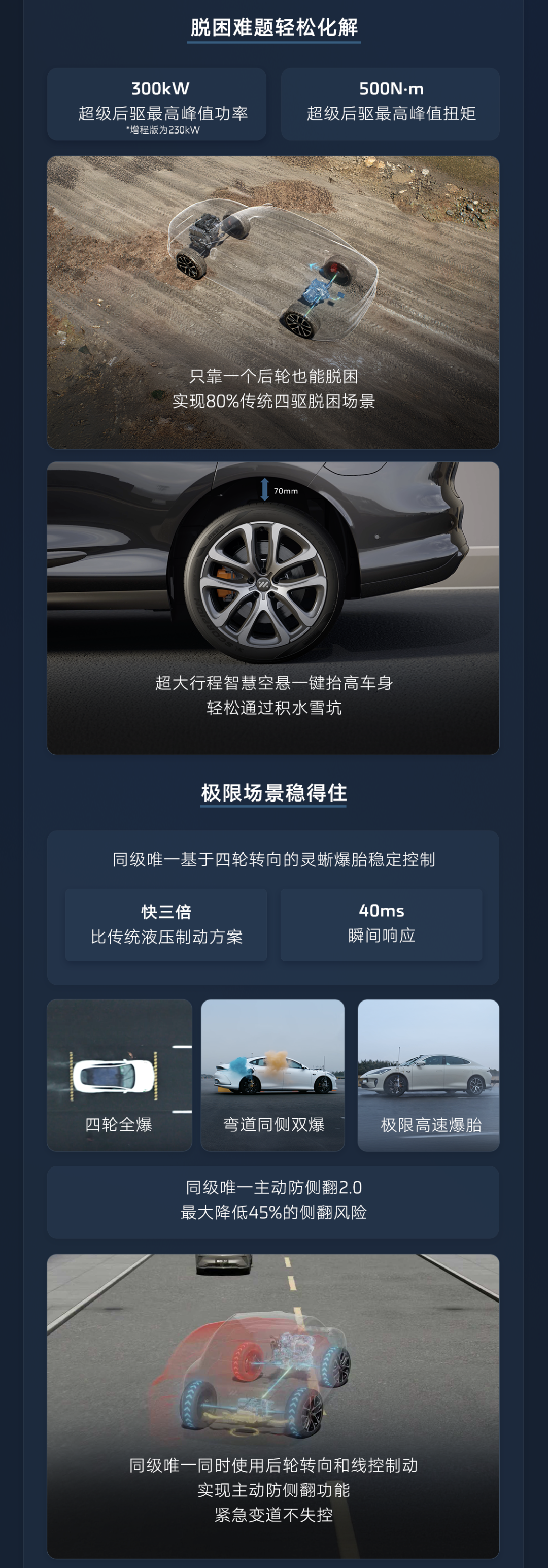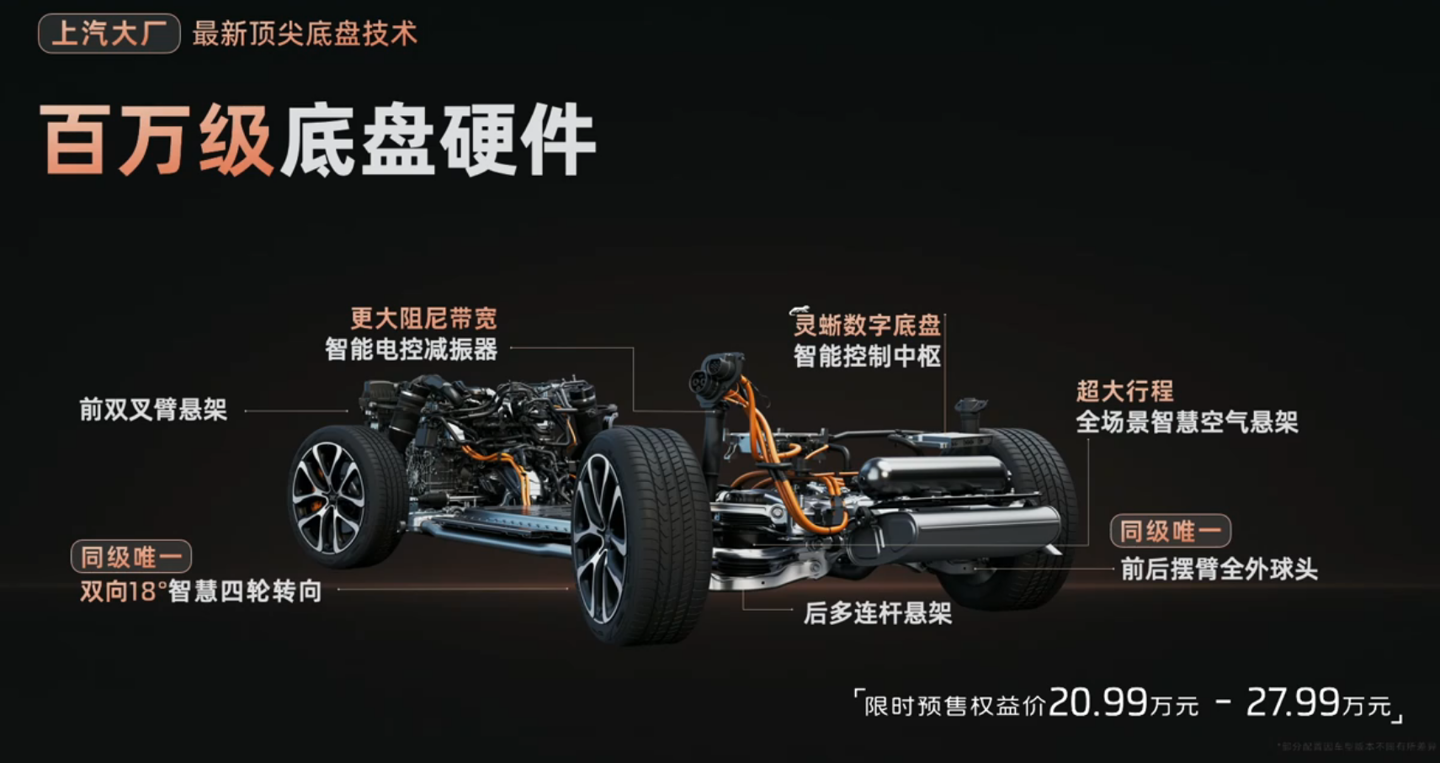 新车全系配备 800VSiC 飓风电机,顶配双电机峰值功率可达 500 千瓦,峰值扭矩 800 牛・米,百公里加速仅需 3.48 秒;还有灵蜥数字底盘 2.0,超级后驱号称“比肩四驱”,前双叉臂 + 后多连杆悬架,支持智慧四轮转向。