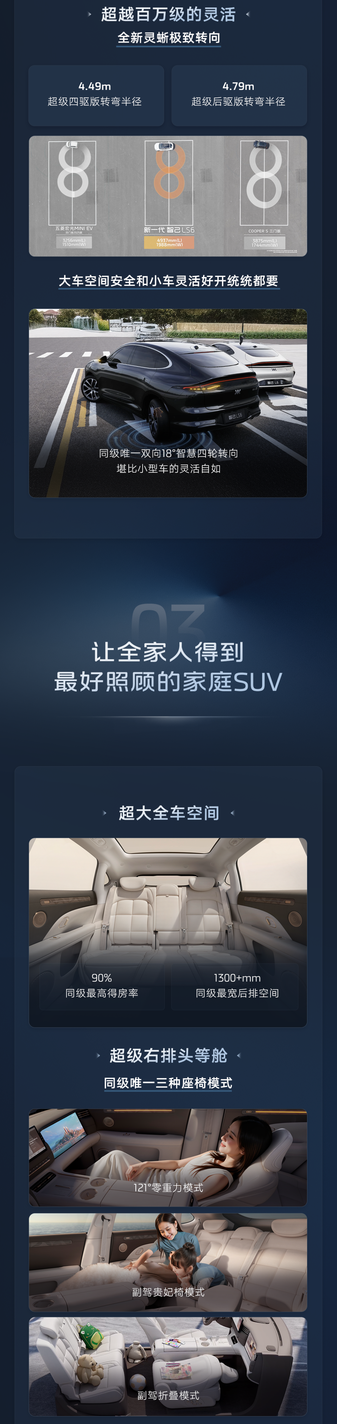新一代智己 LS6 定位超级大五座智能 SUV,将首搭智己“恒星”超级增程,综合续航达 1500+km,还搭载了灵蜥数字底盘 2.0,配备了全新德国大陆 MKC2 线控制动系统、灵蜥爆胎稳定控制系统、全新主动防侧翻 2.0,转弯半径仅有 4.79m。