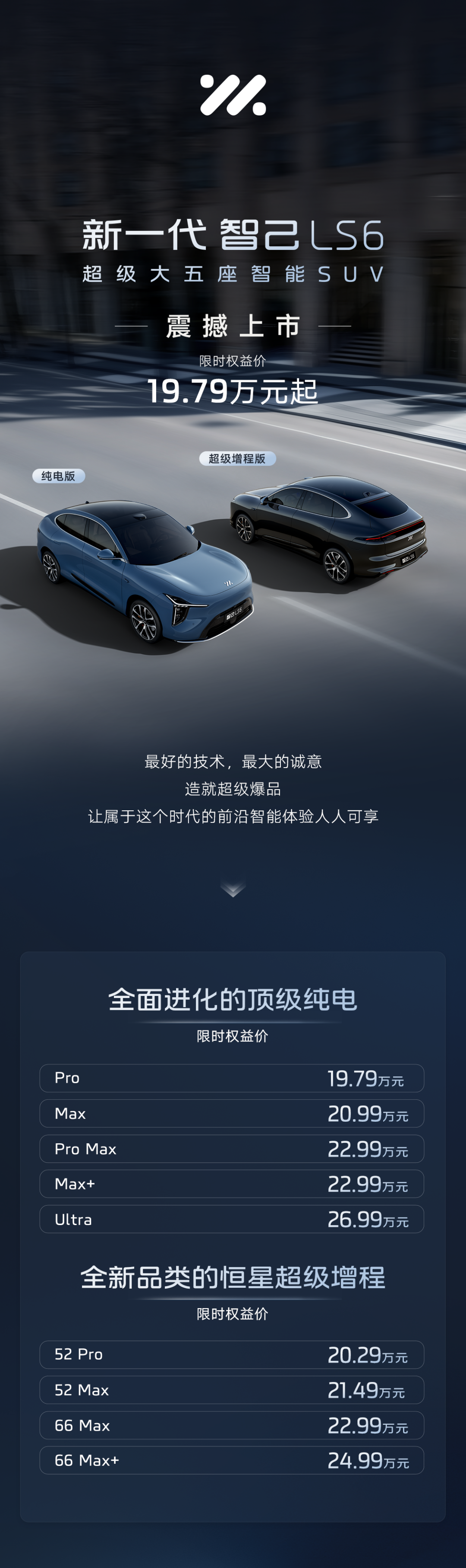IT之家 9 月 10 日消息,新一代智己 LS6 汽车今日正式上市,纯电版上市权益价 19.79 万元起,增程版上市权益价 20.29 万元起。