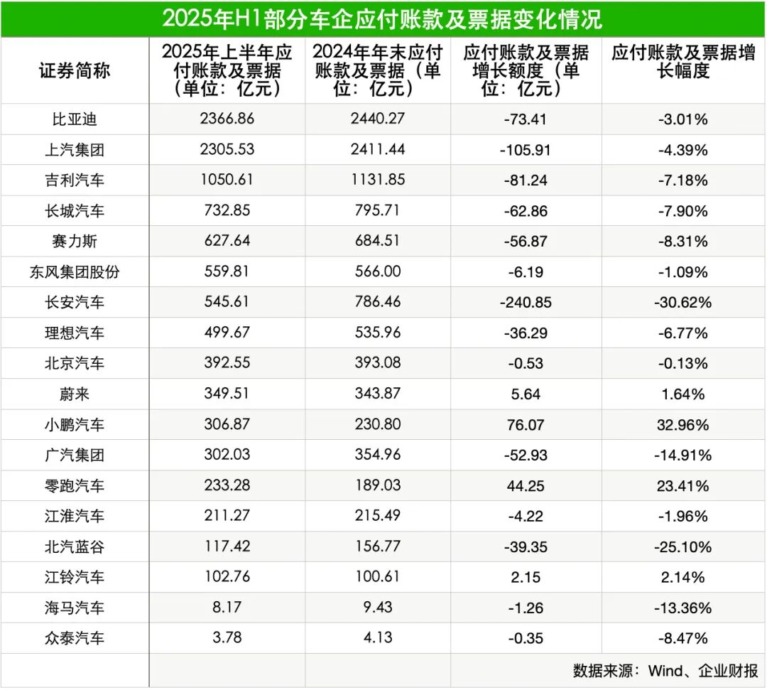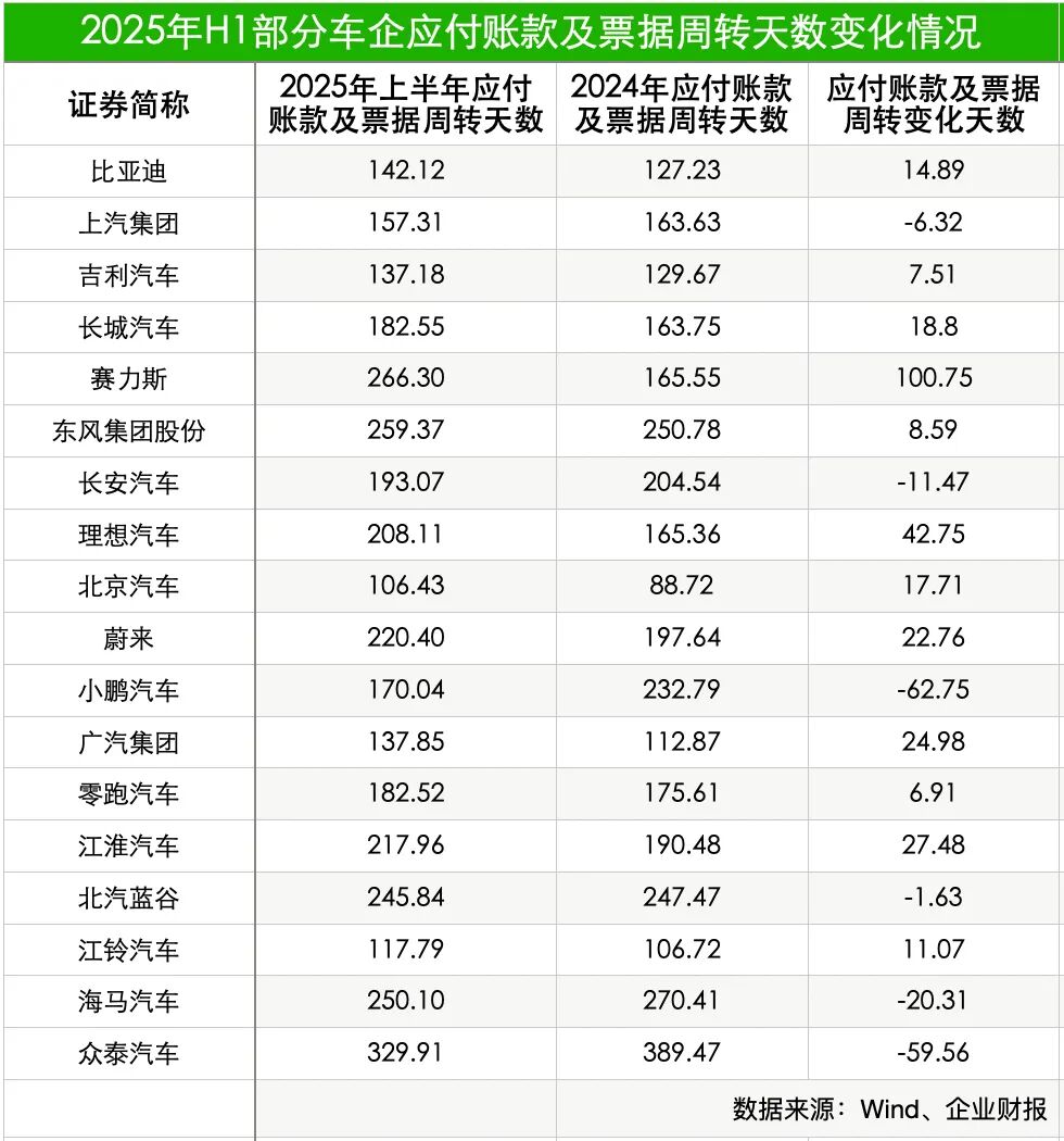值得注意的是,尽管整体应付账款及票据周转天数变化不大,但部分企业已在财报中明确表示将采取相应措施。例如,比亚迪方面在财报中提及,上半年进一步优化账期管理及渠道管理,应付账款及应付票据周转天数处于汽车行业较低水平。