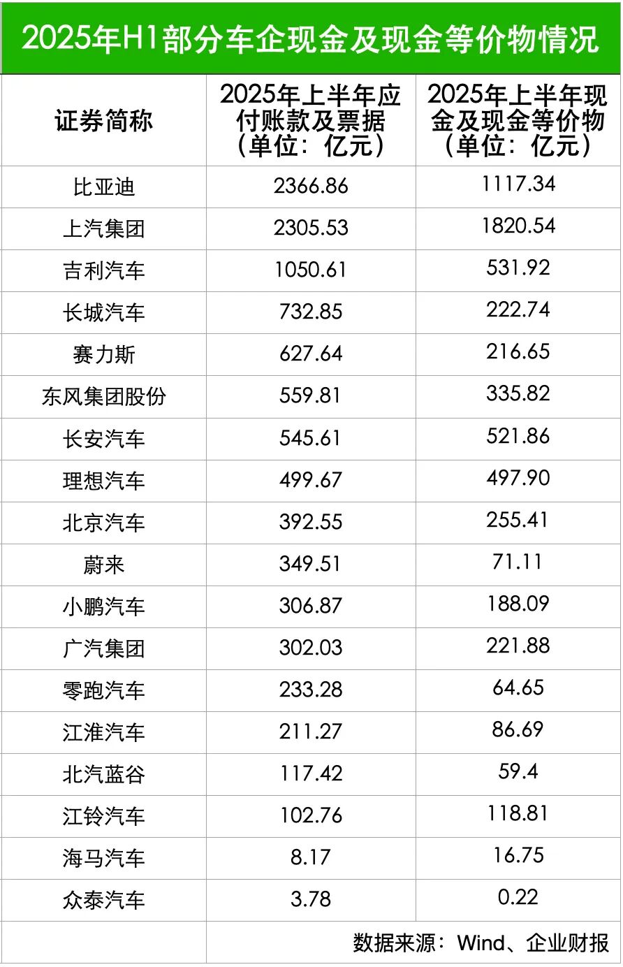 细化至个体,比亚迪、上汽集团、吉利汽车位居“应付款前三”,上半年应付账款及票据分别达2366.86亿元、2305.53亿元和1050.61亿元,均突破千亿关口。若以相对应的周转天数衡量,众泰汽车、赛力斯、海马汽车位列“账期最长”前三。