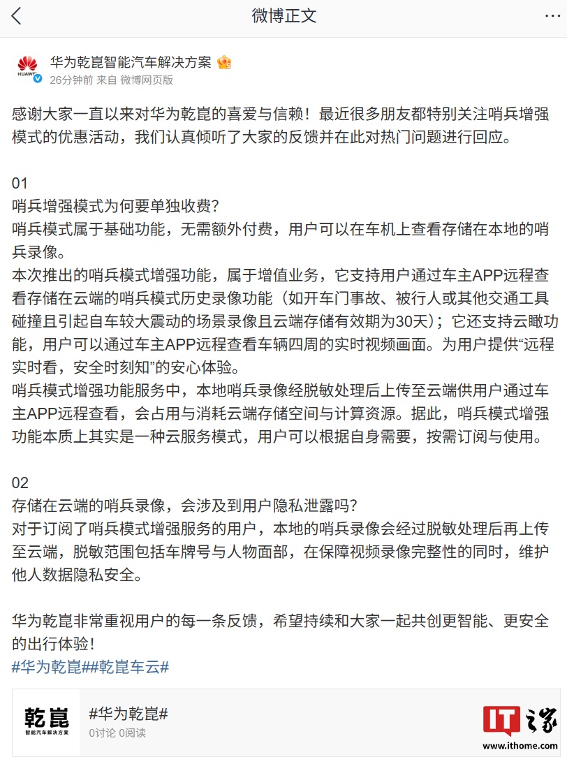 IT之家注意到,华为智能汽车解决方案 BU 官方微博今日发文回应了用户所关注的热门问题,其中包括哨兵增强模式为何要单独收费、存储在云端的哨兵录像是否会涉及到用户隐私泄露。原文如下: