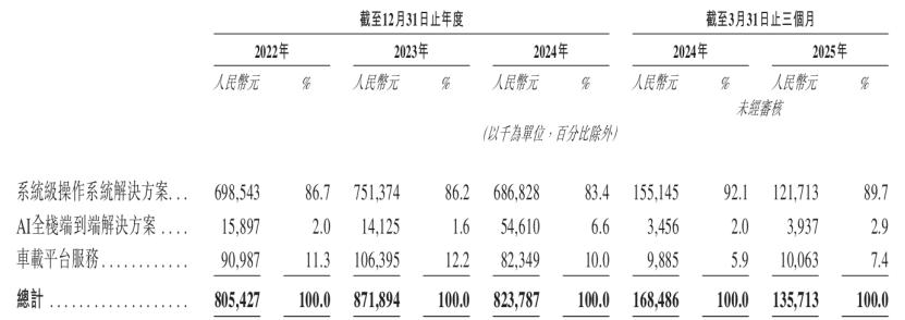按产品线来划分,2025年1-3月,系统级操作系统解决方案的收入占比为89.7%,AI全栈端到端解决方案的收入占比为2.9%,车载平台服务的收入占比为7.4%。