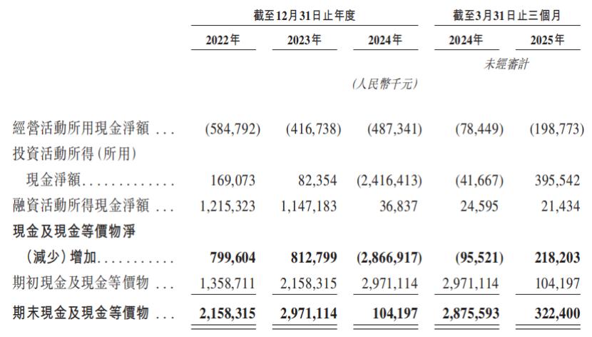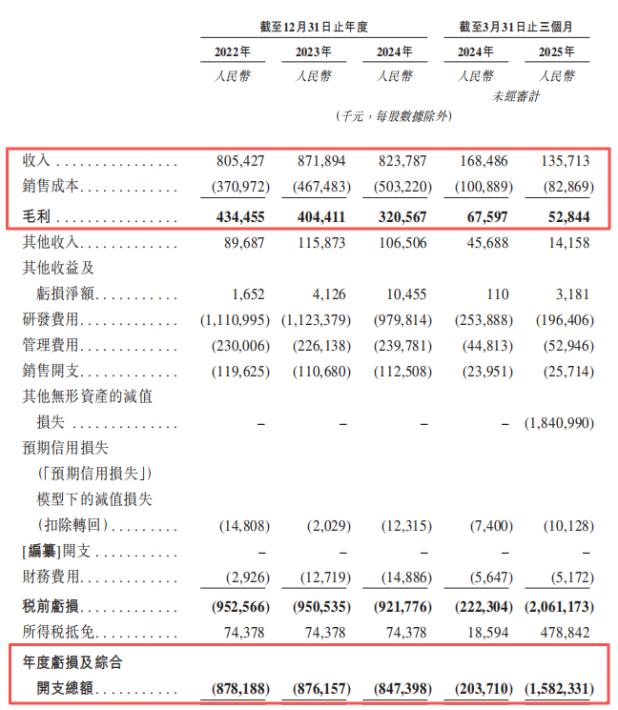2022年、2023年、2024年、2025年1-3月(报告期),公司的收入分别为8.05亿元、8.72亿元、8.24亿元、1.36亿元,净利润分别为-8.78亿元、-8.76亿元、-8.47亿元、-15.82亿元,报告期累计亏损41.84亿元。