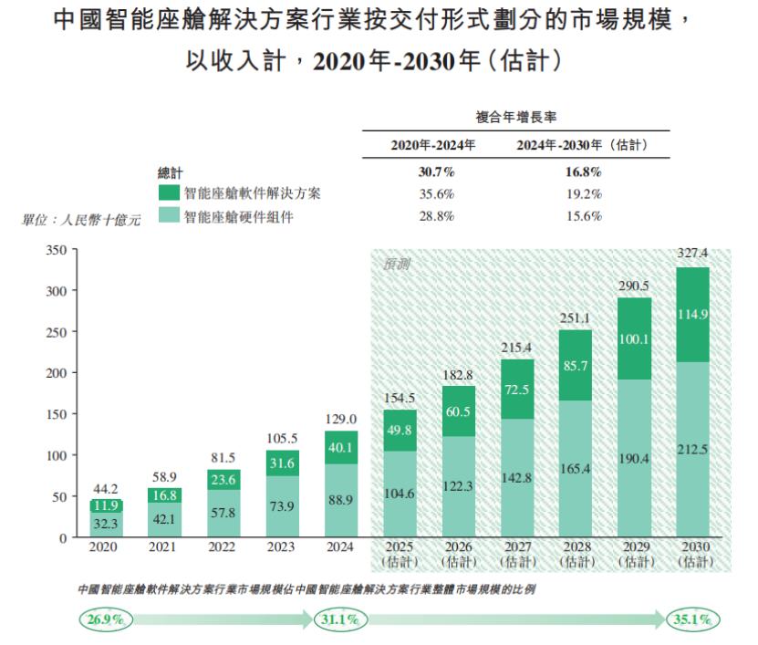 中国智能座舱解决方案市场规模预计将从2024年的1290亿元增长至2030年的3274亿元,复合年增长率为16.8%。