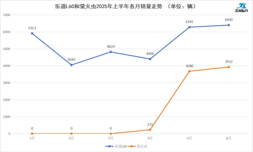 乐道L60和萤火虫2025年上半年各月销量走势,数据来源于公开数据,飞说智行制图