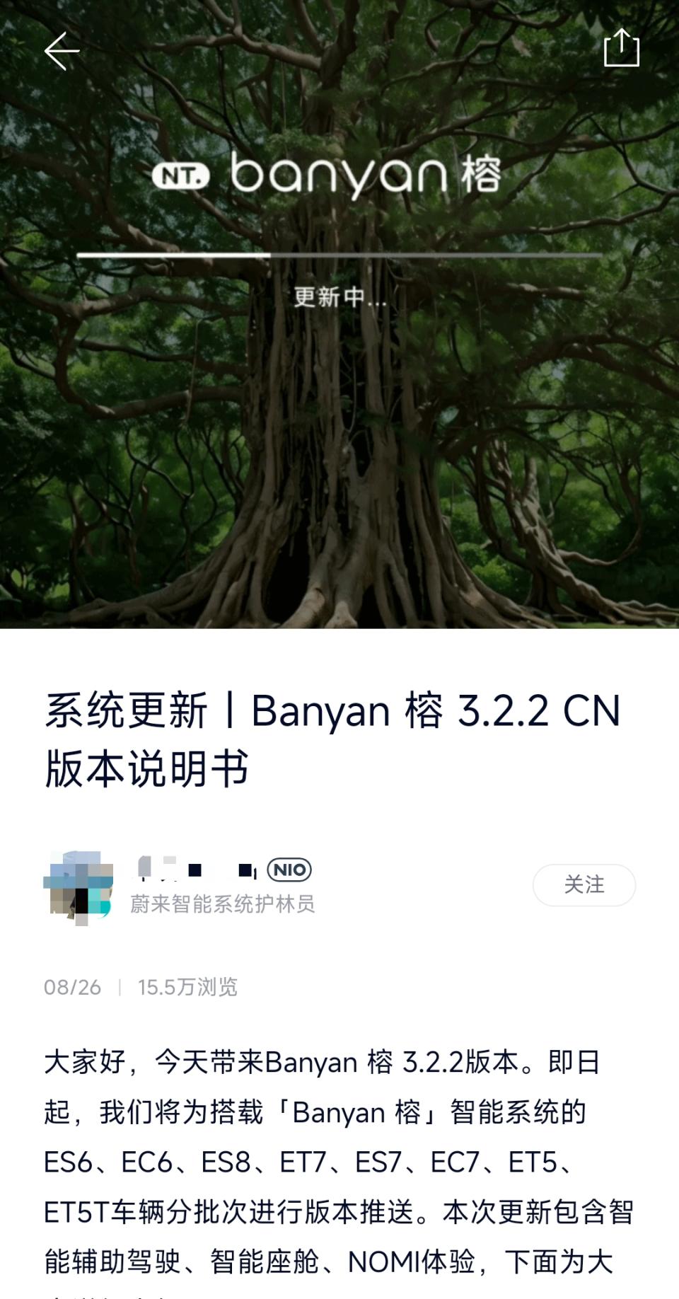 Banyan榕3.2.2版本系统推送升级通知,截图自蔚来APP