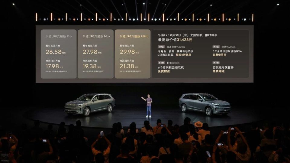 7月31日晚,乐道L90正式上市,大六座SUV该具备的冰箱、彩电和大沙发全部具备,空间上也很富足,以至于李斌喊出了“坐坐都是VIP,6人10箱无压力”的口号,再加上还能和蔚来共享换电服务,可以说堆料配置拉满了。