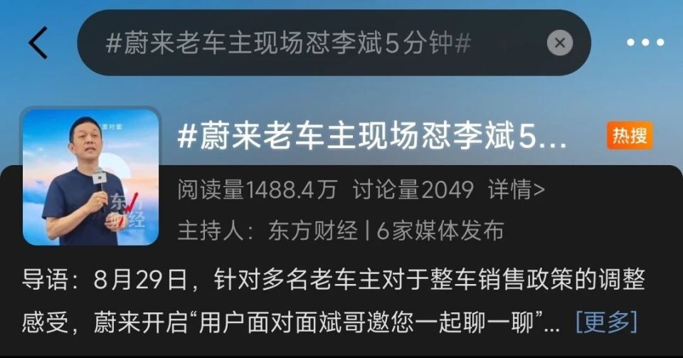 正因这样,在成都车展期间的蔚来“有用户面对面斌哥邀您一起聊一聊”活动上,一位老车主在活动中直面CEO李斌,表达了自己对蔚来在产品迭代、价格策略、用户服务等方面的不满,一度把李斌“怒怼”上了热搜。