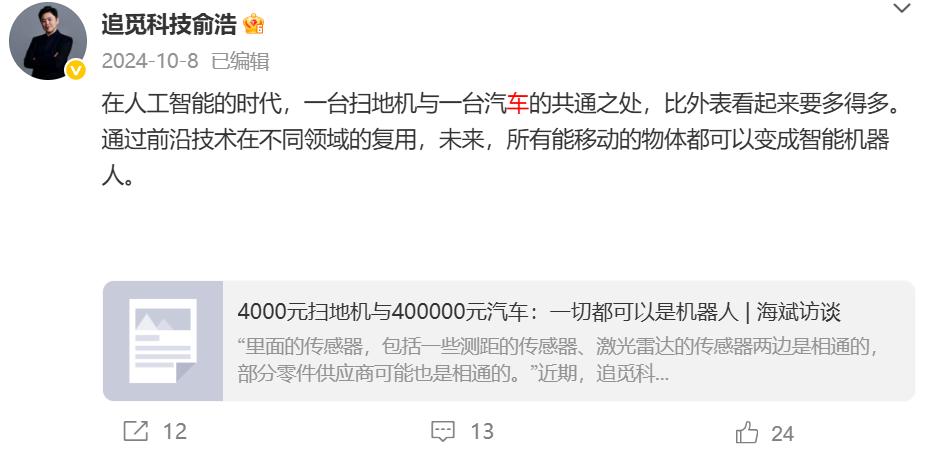 去年10月,俞浩转发了一篇探讨扫地机器人与汽车技术异同的媒体报道,并说道“在人工智能时代,一台扫地机器人与一台汽车的共通之处,比外表看起来要多得多。”