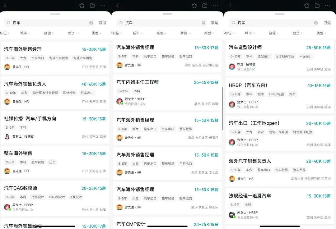 尽管汽车业务在国内如何推进仍在迷雾中,但追觅的相关岗位已经在不断开放。在BOSS直聘上以“汽车”为岗位关键词搜索,会发现不少在招岗位,且招聘者当日活跃。岗位包括汽车海外销售经理、汽车造型设计师、汽车内饰主任工程师、HRBP(汽车方向)、社媒传播(汽车/手机方向)等,整体月薪从1.5万元起跳,最高月薪甚至能达到6万元,工作地点遍布国内多地。