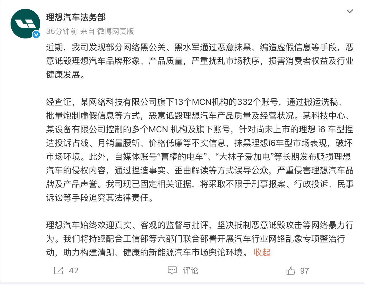 凤凰网科技讯 9月11日,理想汽车法务部发文称,部分网络黑公关、黑水军通过恶意抹黑、编造虚假信息等手段,恶意诋毁理想汽车品牌形象、产品质量。