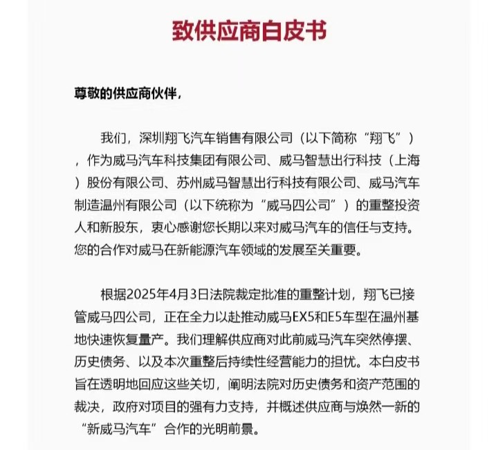 新东家的一则公告,让威马汽车的供应商及老车主们,又看到了希望!