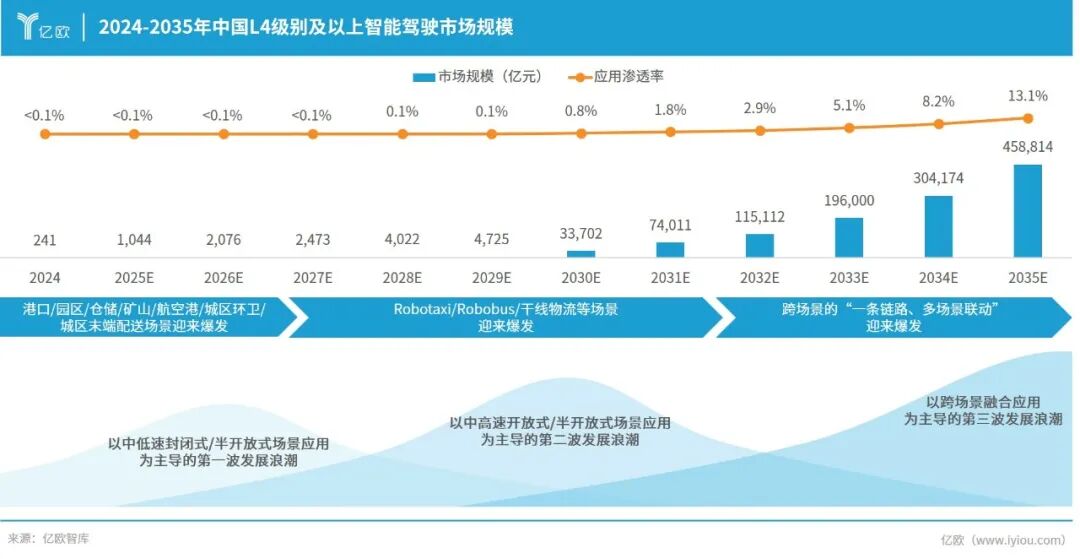 2025年L4智驾场景化应用加速发展,亿欧汽车研究院认为2035年中国L4级别及以上智能驾驶市场规模有望突破45万亿元。