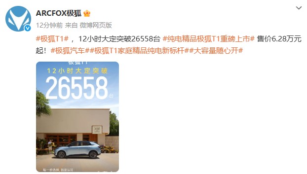 9月12日,北汽蓝谷旗下极狐品牌发文称,极狐T1车型12小时大定突破26558台。