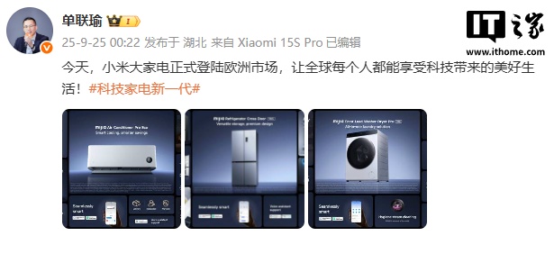 IT之家 9 月 25 日消息,小米集团大家电部总经理单联瑜今日凌晨发文称:“今天,小米大家电正式登陆欧洲市场,让全球每个人都能享受科技带来的美好生活!”此外,他还分享了三张产品海报,分别为空调、冰箱、洗衣机。