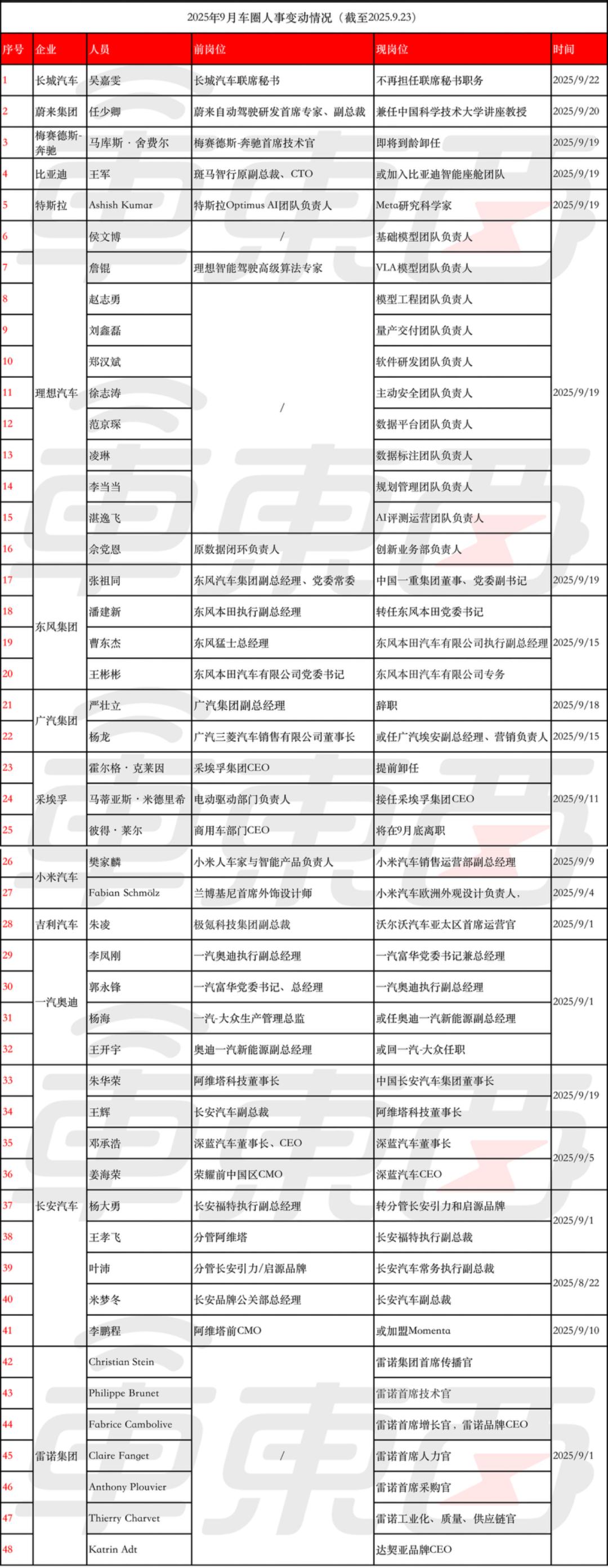 这其中就包括了国内9大自主车企,分别是比亚迪、吉利、长城、长安、广汽、东风、理想、蔚来、小米。与此同时,海外车企以及合资品牌如特斯拉、梅赛德斯-奔驰、一汽奥迪、雷诺集团也传出了人事调整的消息。