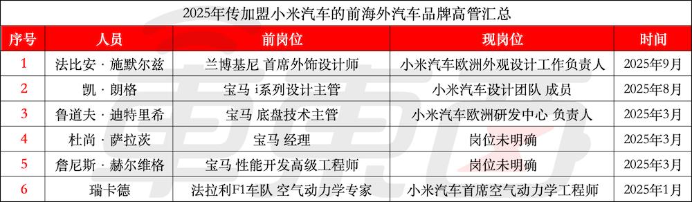 至此在2025年,来自海外品牌的高管至少有六位被曝加盟小米汽车。