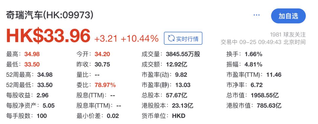 9月25日港股开盘,奇瑞汽车正式登陆港交所,其香港IPO发行价定为每股30.75港元。开盘后高开11%,总市值接近2000亿港元。