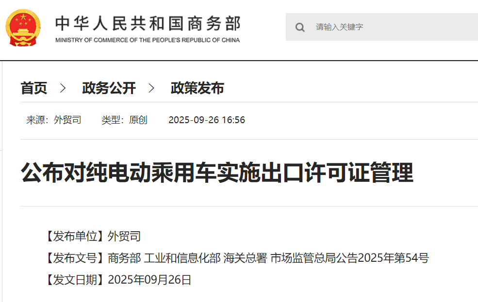 IT之家 9 月 26 日消息,据商务部官网今日消息,为促进新能源汽车贸易健康发展,依据《中华人民共和国对外贸易法》有关规定,商务部、工业和信息化部、海关总署、市场监管总局决定对纯电动乘用车实施出口许可证管理。现将有关事项公告如下: